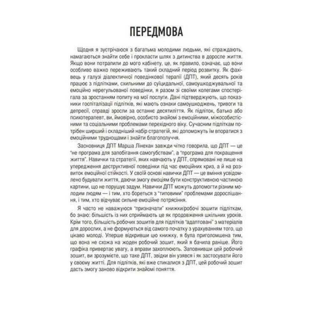 Техніки, що представлені у виданні «Робочий зошит навичок ДПТ для підлітків: захоплююча інструкція для керування тривогою та стресом, розуміння своїх емоцій та вивчення ефективних навичок комунікації», допоможуть підлітку легше перейти в доросле життя. Прочитайте цей робочий зошит навичок ДПТ для підлітків, щоб навчитися ефективно справлятися зі стресом, сильними почуттями й емоціями, а також керувати міжособистісними стосунками та долати відмови й невдачі.