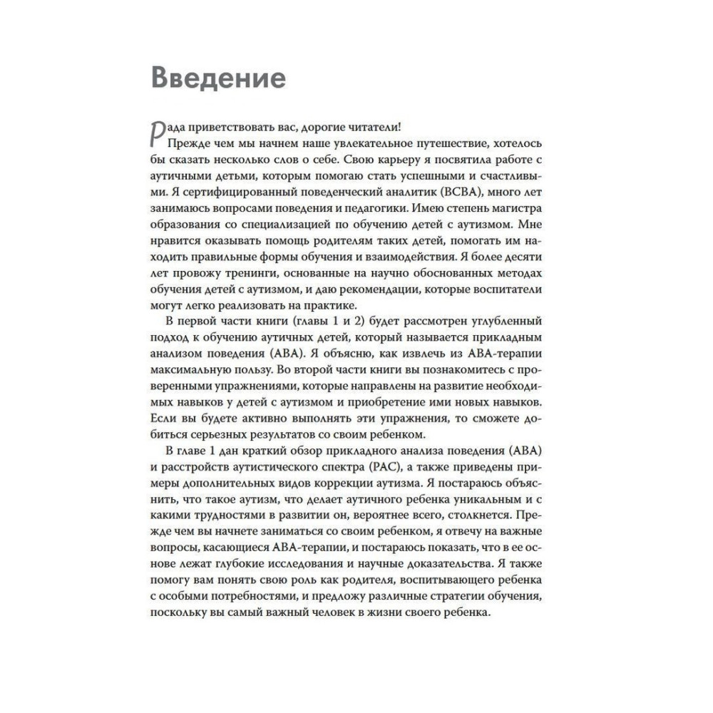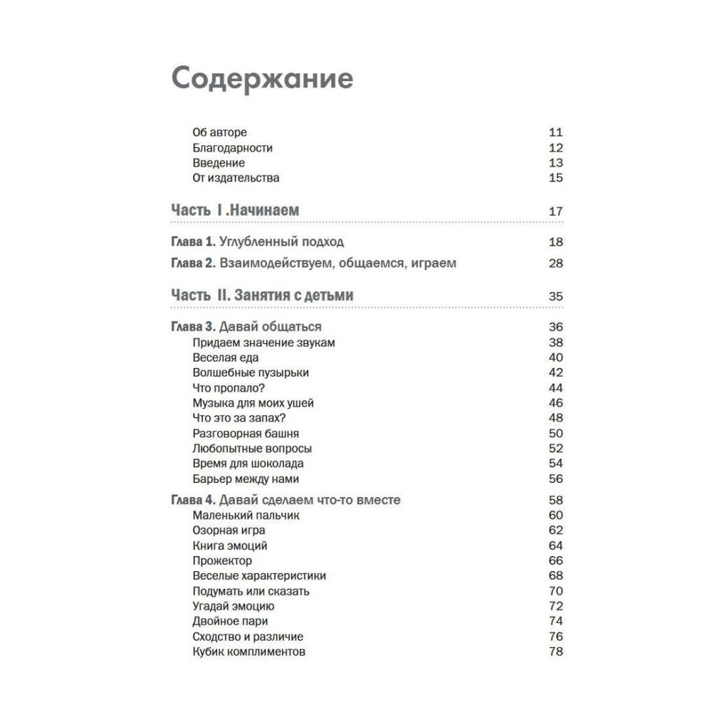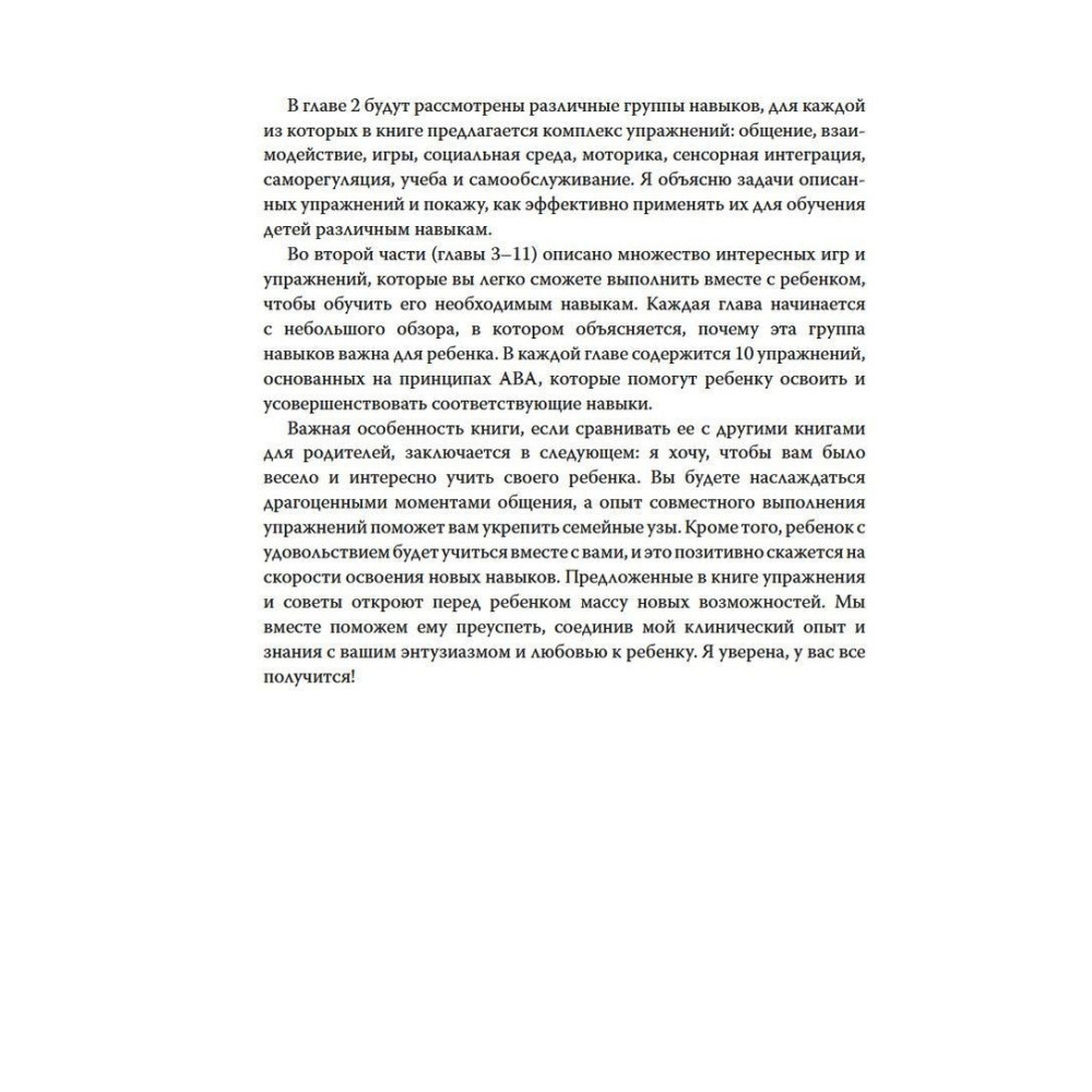 У книзі описано 90 ігрових, науково обґрунтованих вправ, призначених для батьків, які виховують дитину з аутизмом. Читачам пропонується простий та ефективний комплекс занять, покликаних доповнити й підтримати ту корекційно-розвивальну роботу з дітьми, яку проводять батьки та вихователі. Вправи орієнтовані на дітей віком від року до 11 років, але їхні результати позначатимуться все життя.