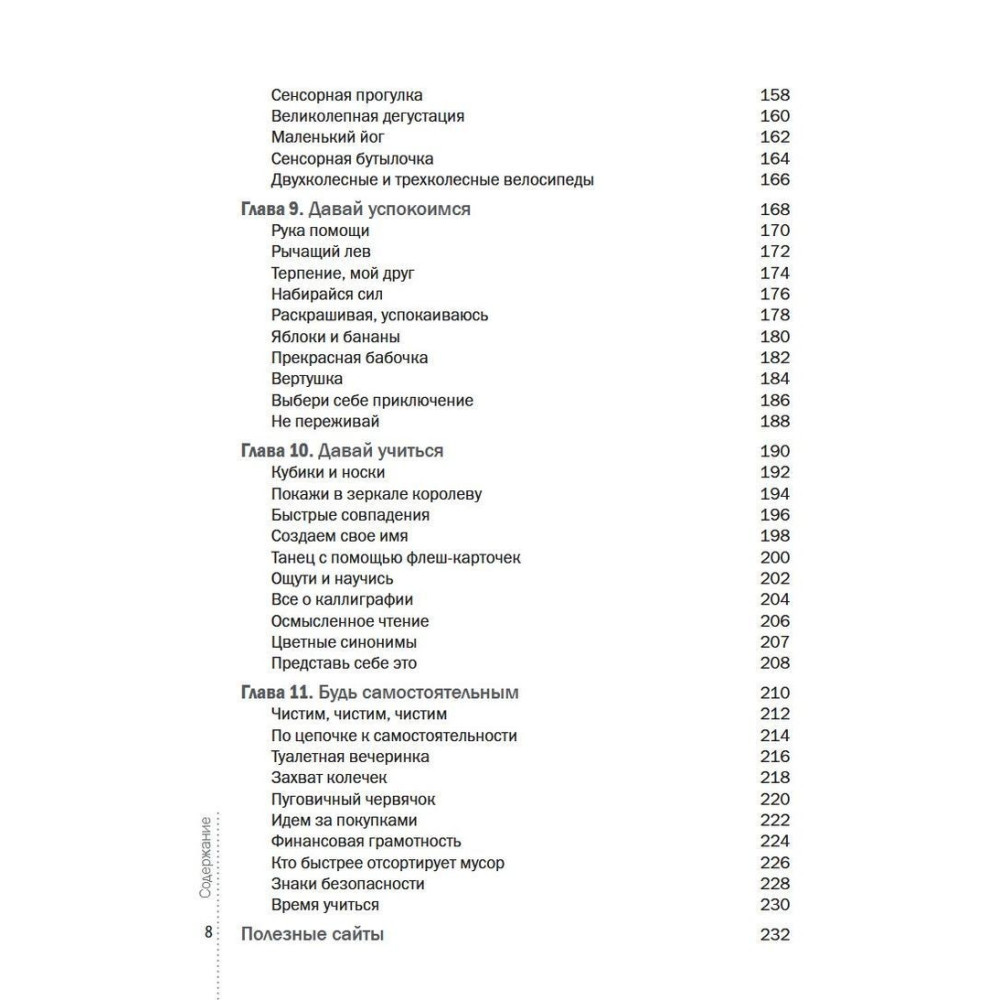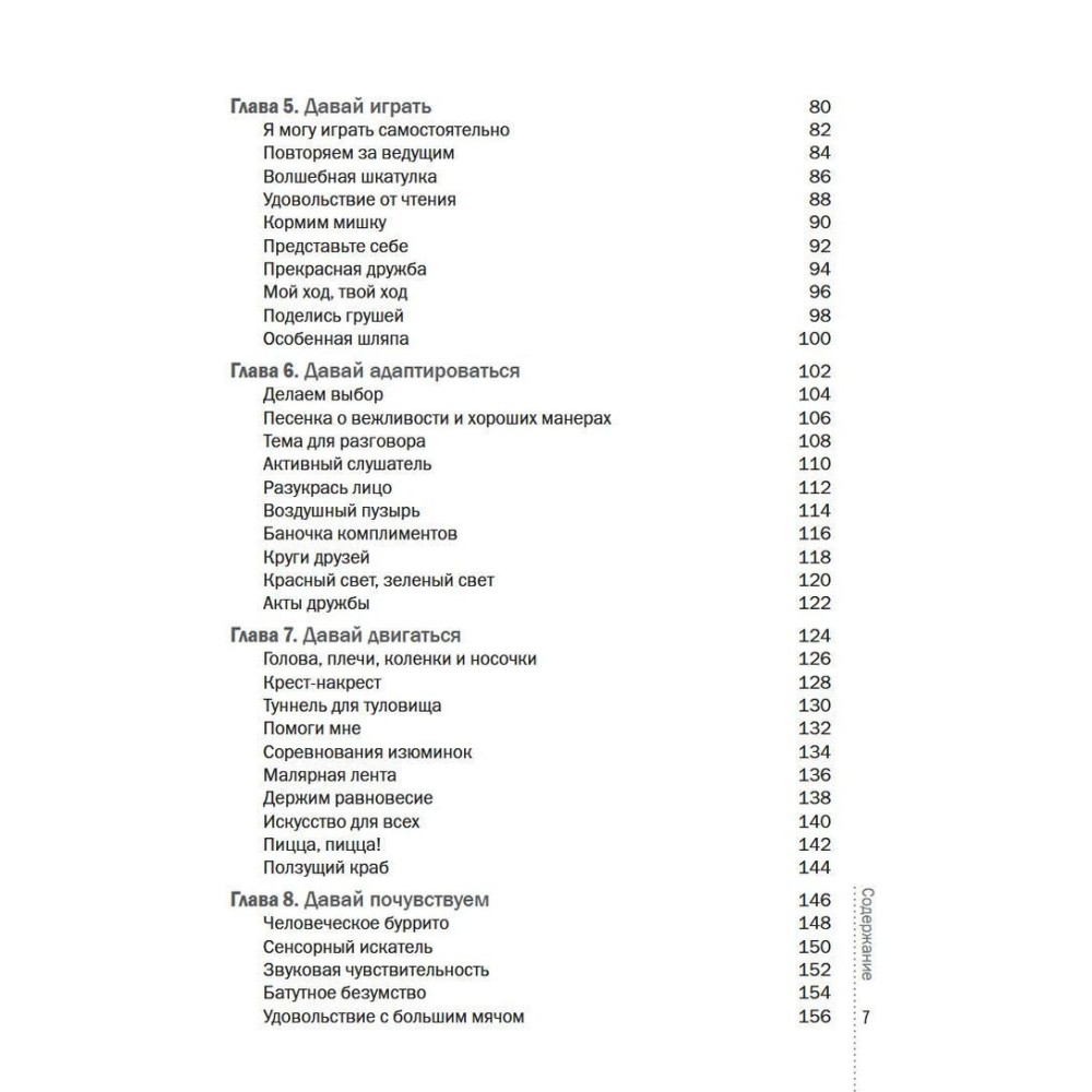 Також у ній розглянуто практичні, повсякденні способи роботи з дитиною, починаючи з розвитку вміння вибудовувати діалог і закінчуючи спілкуванням з іншими дітьми. Такі вправи, як «Акти дружби», «Людське буріто» та «Вгадай емоцію», допоможуть дитині з аутизмом покращити свої навички спілкування, взаємодії та саморегуляції.