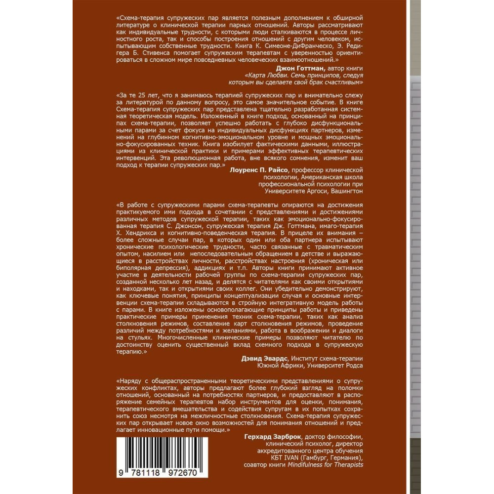 Командна праця «Схема-терапия супружеских пар. Практическое руководство по исцелению отношений» від К'яри Сімеоне-ДіФранческо, Екхарда Редігера та Брюса А. Стівенса буде чудовим підручником як із подружньої терапії, так і з методу схема-терапії, який набирає дедалі більшої популярності.