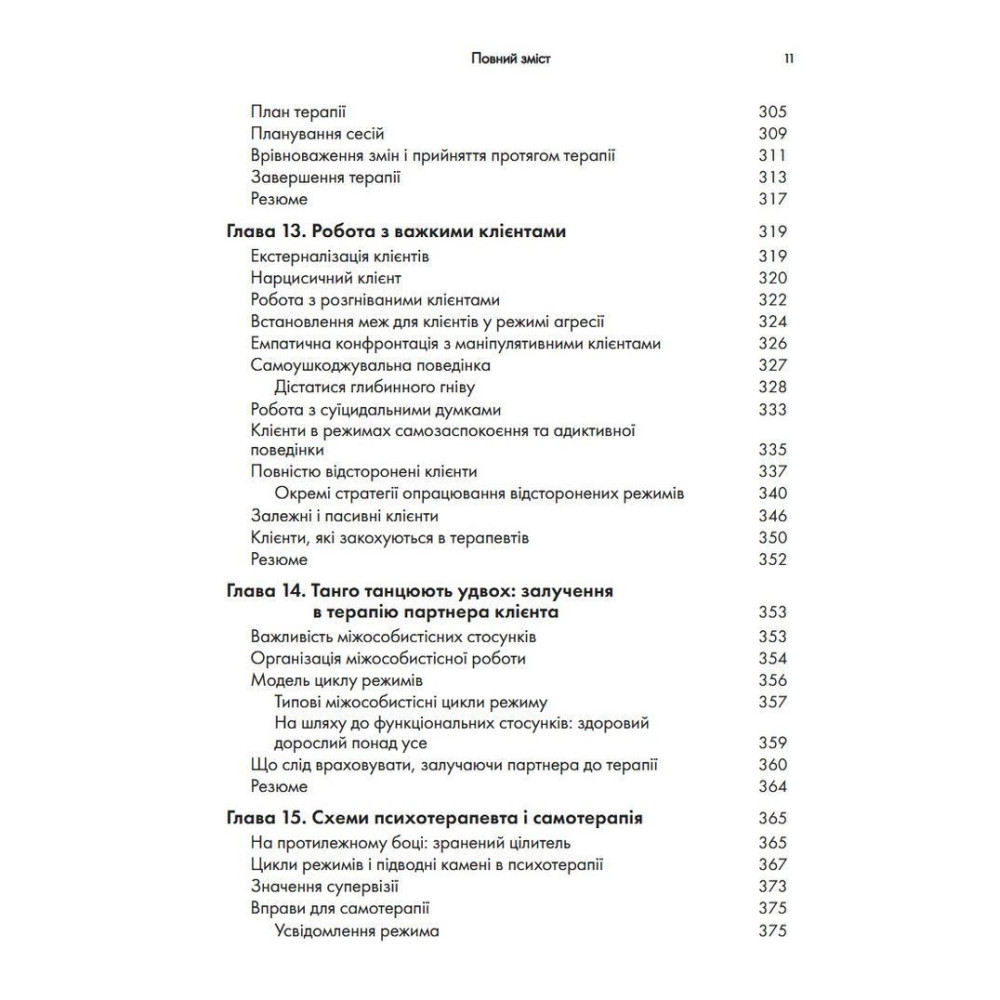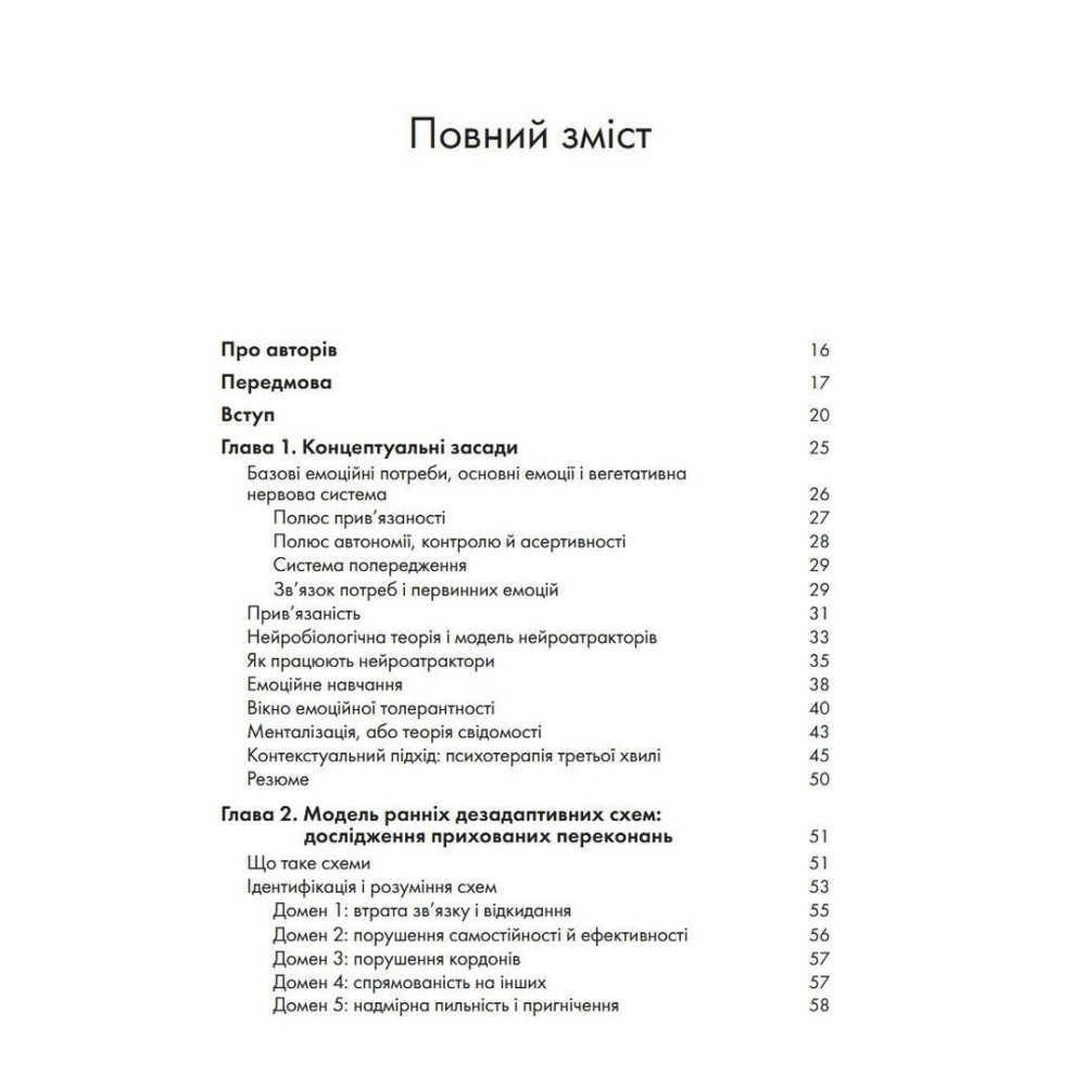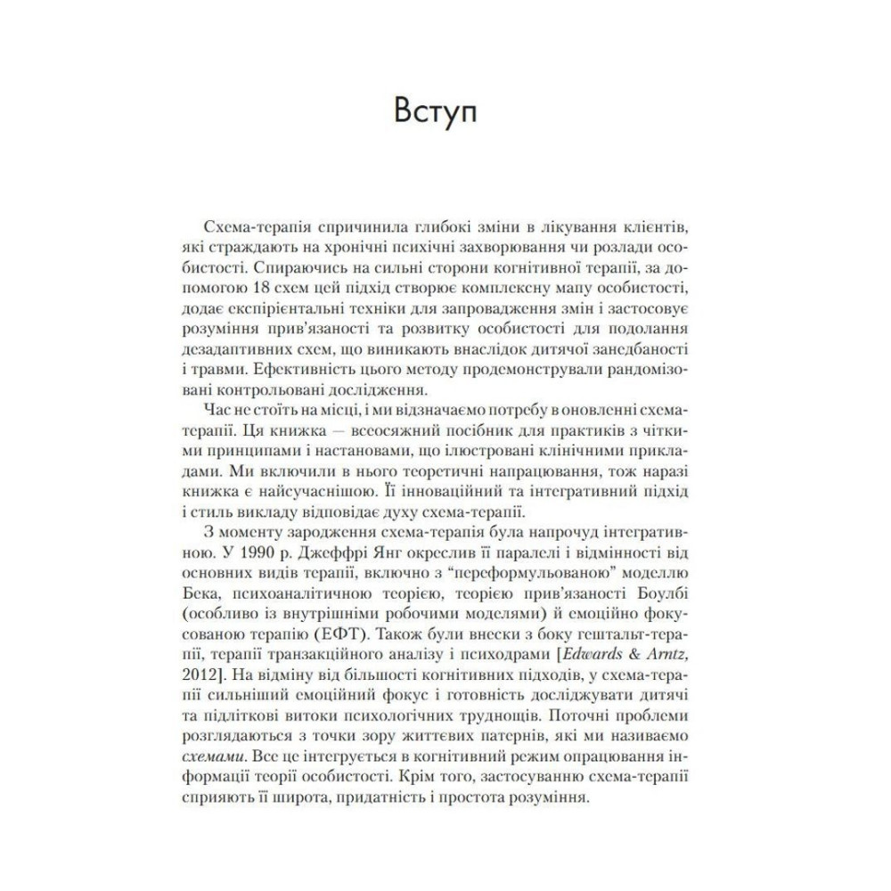 Три всесвітньо відомі психотерапевти представляють у цій книзі найсучасніші інновації у схема-терапії. Пропонується чітка дорожня карта для застосування моделі схема-терапії на практиці з метою покращення міжособистісного функціонування клієнтів. Схема-терапія — потужна інтегративна терапевтична модель, в якій поєднуються аспекти когнітивної, поведінкової і психодинамічної терапії. Вона довела високу ефективність у роботі з низкою проблем психічного здоров'я, в тому числі з розладами особистості, які важко піддаються лікуванню. Положення схема-терапії виходять із передумови, що проблеми психічного здоров'я виникають внаслідок незадоволення емоційних потреб у дитинстві, що призводить до розвитку ранніх дезадаптивних схем. Однак схема-терапія все більше відходить від останніх і зосереджується на змісті схем, на зміні ставлення клієнтів до свого досвіду.