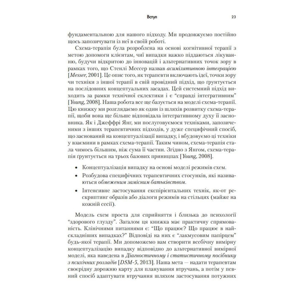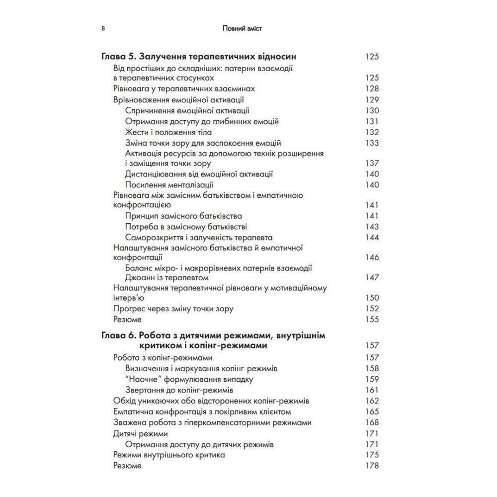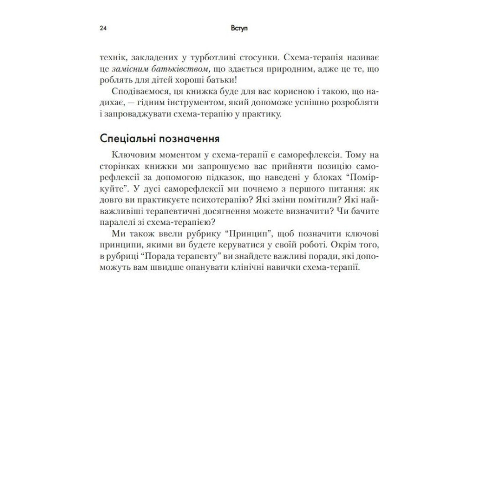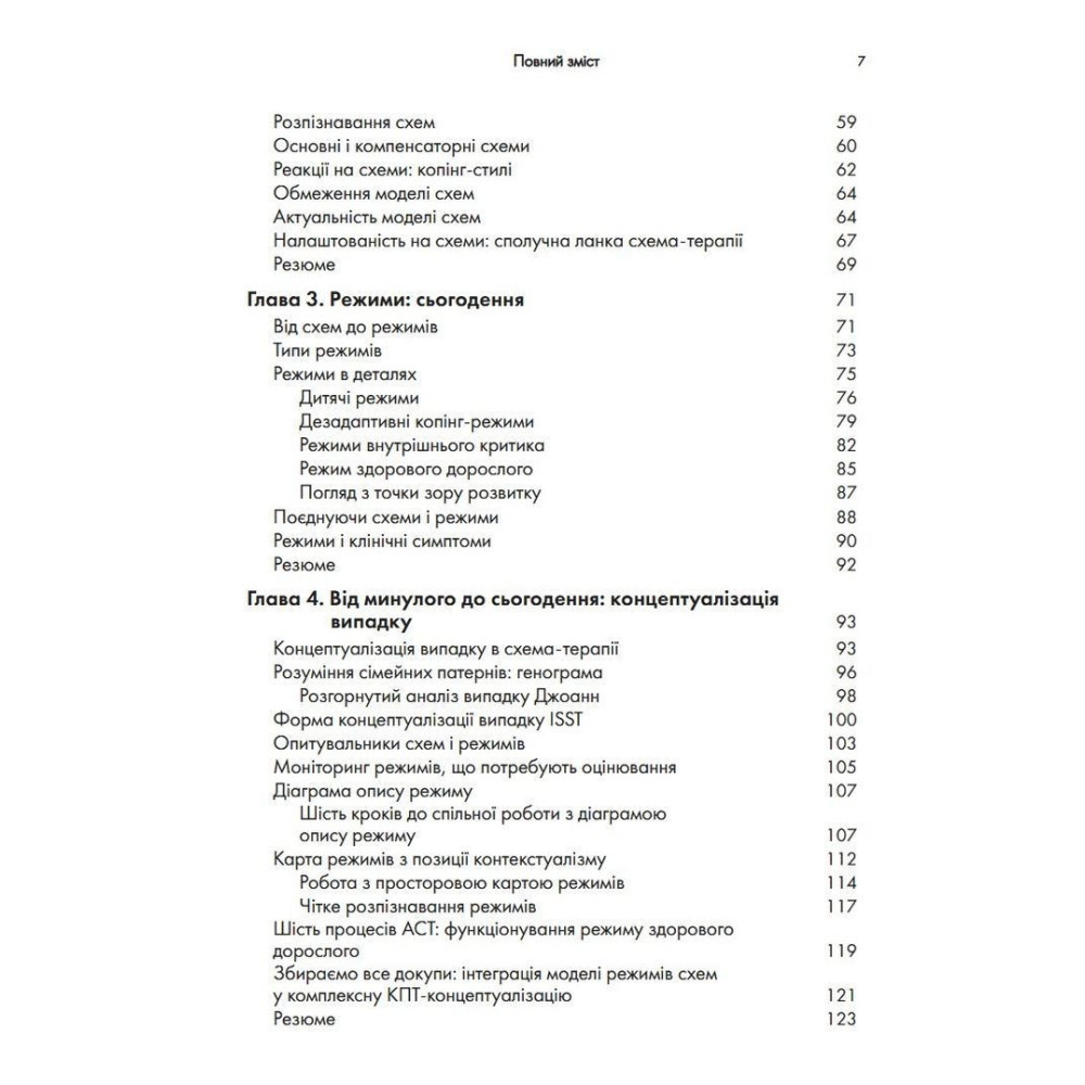 Три всесвітньо відомі психотерапевти представляють у цій книзі найсучасніші інновації у схема-терапії. Пропонується чітка дорожня карта для застосування моделі схема-терапії на практиці з метою покращення міжособистісного функціонування клієнтів. Схема-терапія — потужна інтегративна терапевтична модель, в якій поєднуються аспекти когнітивної, поведінкової і психодинамічної терапії. Вона довела високу ефективність у роботі з низкою проблем психічного здоров'я, в тому числі з розладами особистості, які важко піддаються лікуванню. Положення схема-терапії виходять із передумови, що проблеми психічного здоров'я виникають внаслідок незадоволення емоційних потреб у дитинстві, що призводить до розвитку ранніх дезадаптивних схем. Однак схема-терапія все більше відходить від останніх і зосереджується на змісті схем, на зміні ставлення клієнтів до свого досвіду.