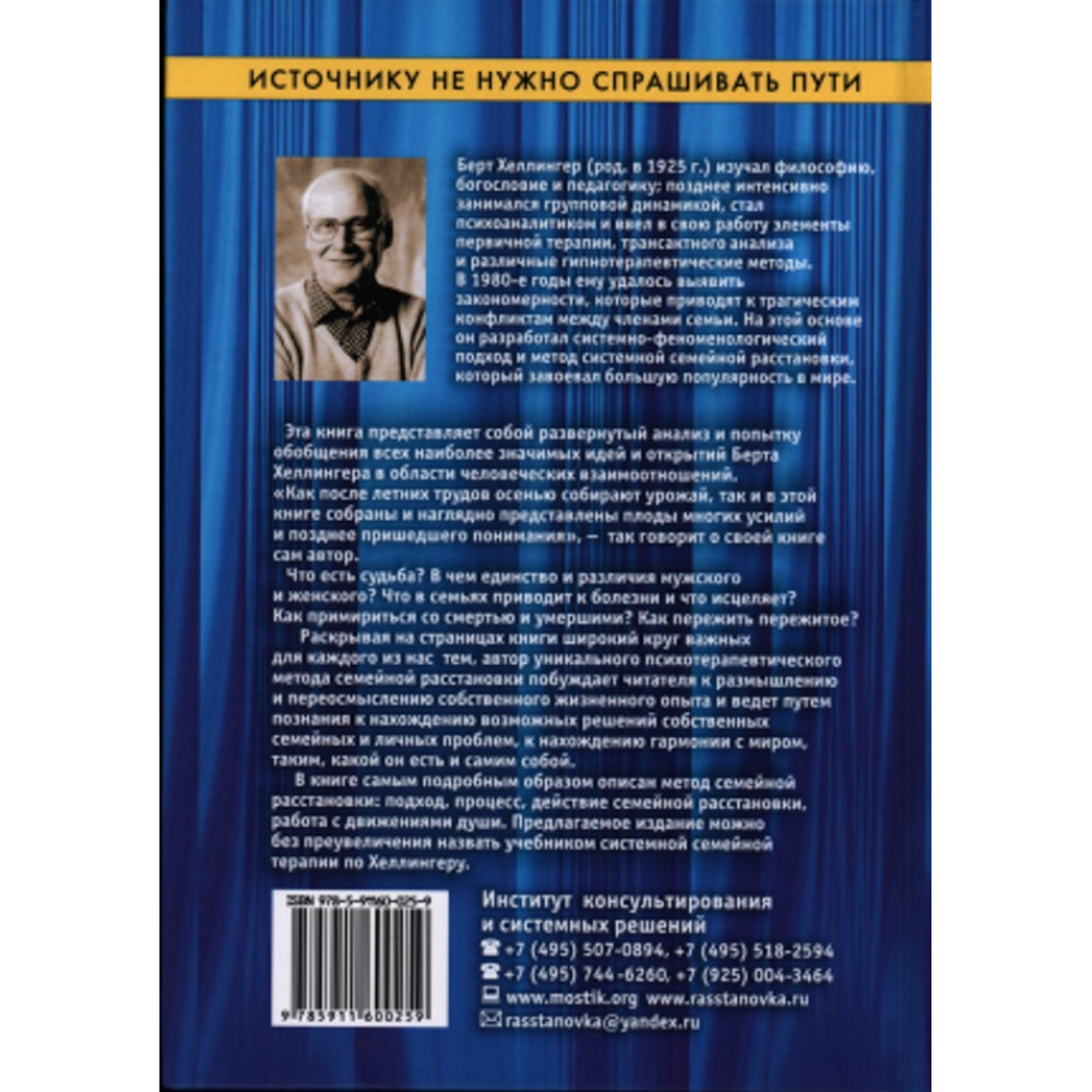 Розкриваючи на сторінках книжки широке коло важливих для кожного з нас тем, автор унікального психотерапевтичного методу родинного розставлення спонукає читача до роздумів і (пере)осмислення власного життєвого досвіду та веде шляхом пізнання до віднаходження можливих розв'язань власних родинних і особистих проблем, до віднаходження гармонії зі світом, таким яким він є і, власне, самим собою.