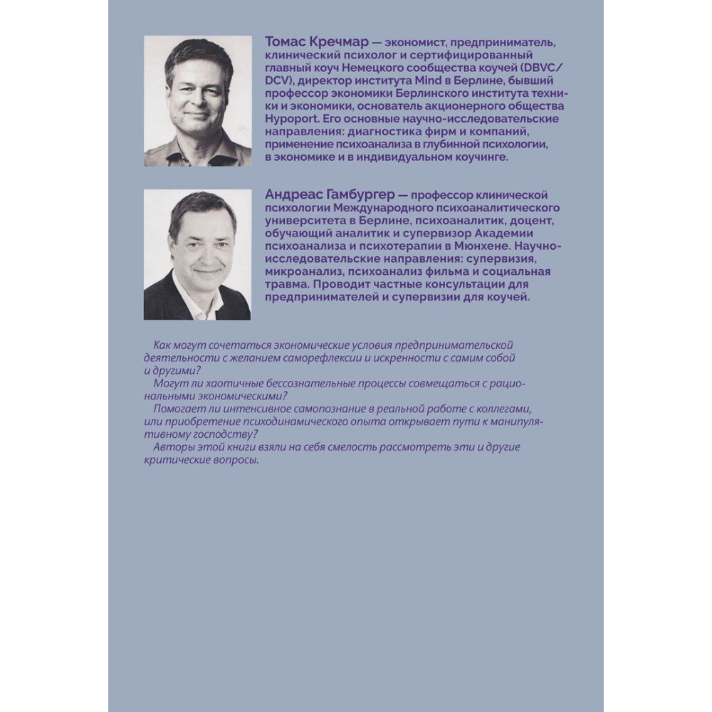 Томас Кречмар — економіст, підприємець, клінічний психолог та сертифікований головний коуч Німецьої спілки коучів (DBVC/DCV), директор інституту Mind в Берліні, колишній професор економіки Берлінського інституту техніки й економіки, засновник акціонерної спільноти Hypoport. Його основні науково-дослідницькі напрямки: діагностика фірм та компаній, застосування психоаналізу у глибинній психології, економіці та в індивідуальному коучінгу.