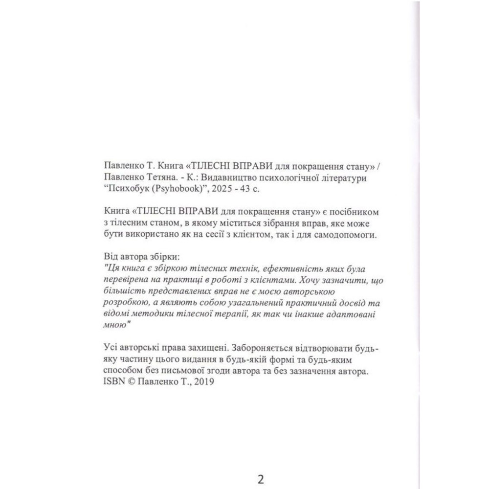 «Ця книга є збіркою тілесних технік, ефективність яких була перевірена на практиці в роботі з клієнтами. Хочу зазначити, що більшість представлених вправ не є моєю авторською розробкою, а являють собою узагальнений практичний досвід та відомі методики тілесної терапії, як так чи інакше адаптовані мною».