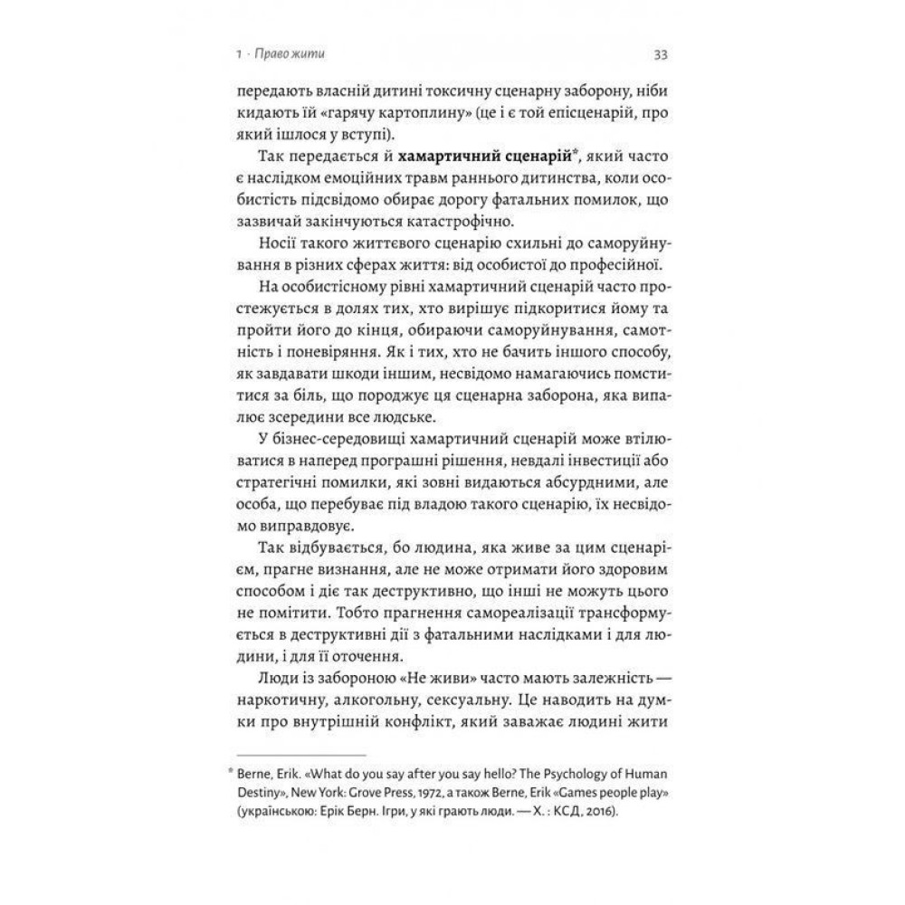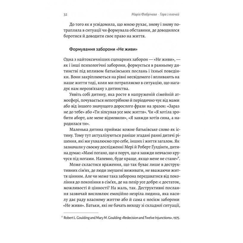 Чи ви помічали як часто думаєте «не судилося», «це просто прокляття» чи «мені ніколи не вдасться»? Спираючись на теорії транзакційного аналізу й багаторічний професійний досвід, психотерапевтка Марія Фабрічева у книжці «Гора з плечей. Як виявити і подолати 13 психологічних заборон» пояснює, що такі думки швидше за все зумовлені життєвим сценарієм і психологічними заборонами, засвоєними ще в ранньому дитинстві.