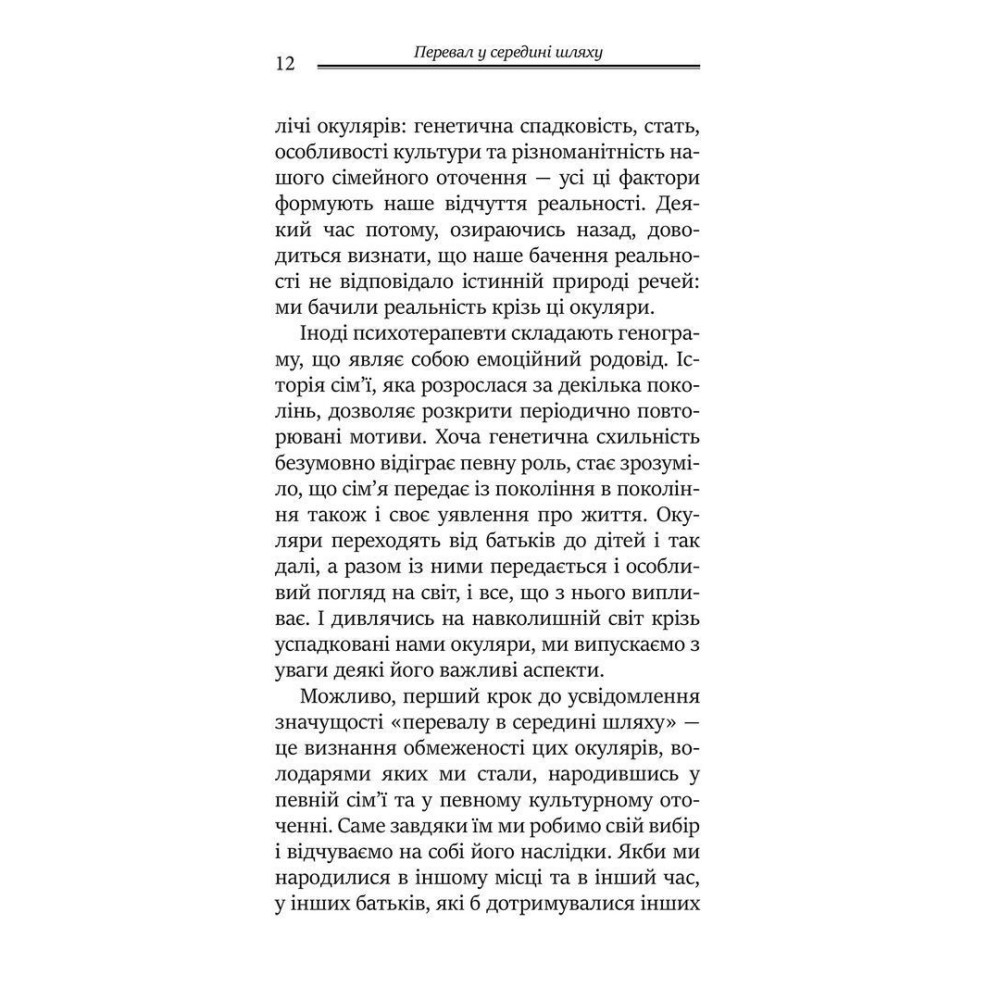 «Перевал у середині шляху. Як подолати кризу середнього віку та знайти новий сенс життя» вперше була видана в Канаді, Торонто, у 1993 році. З тих пір книга стала бестселером, пережила велику кількість видань сімома мовами в різних країнах, у вигляді паперовому, електронному, аудіо. В 2023 році книга видана українською мовою Видавництвом Ростислава Бурлаки, і українські читачі віку "середини шляху" тепер мають можливіть відчути цю підтримку, отримати цінні поради і наповнити своє життя новими сенсами, позитивними емоціями, щастям.