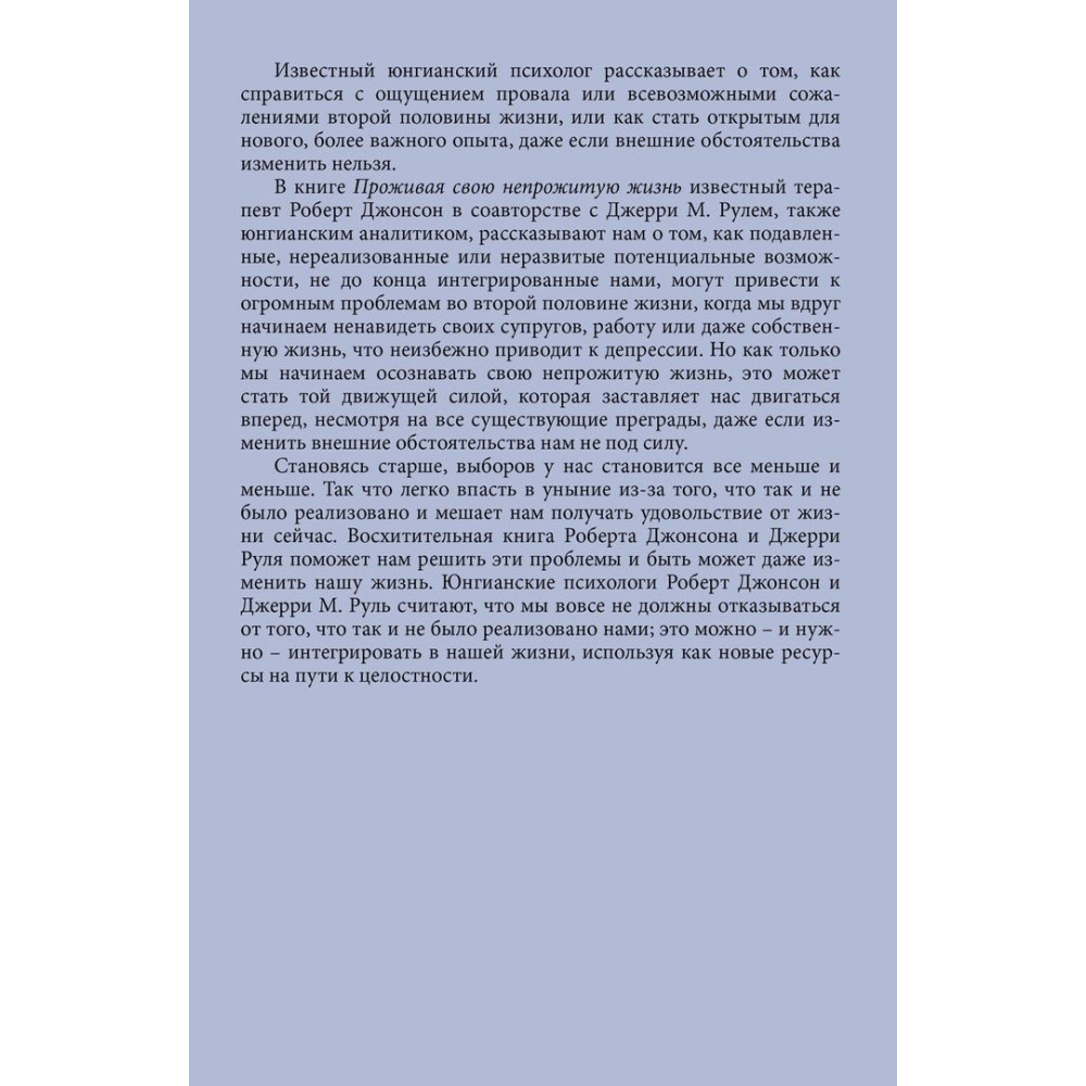 Відомий юнґіанський психолог Роберт А. Джонсон розповідає у книзі «Проживая свою непрожитую жизнь», яку він написав разом із Джеррі М. Рулем, про те, як упоратися з відчуттям провалу або всілякими жалем другої половини життя, або як стати відкритим для нового, важливішого досвіду, навіть якщо зовнішні обставини змінити не можна.
