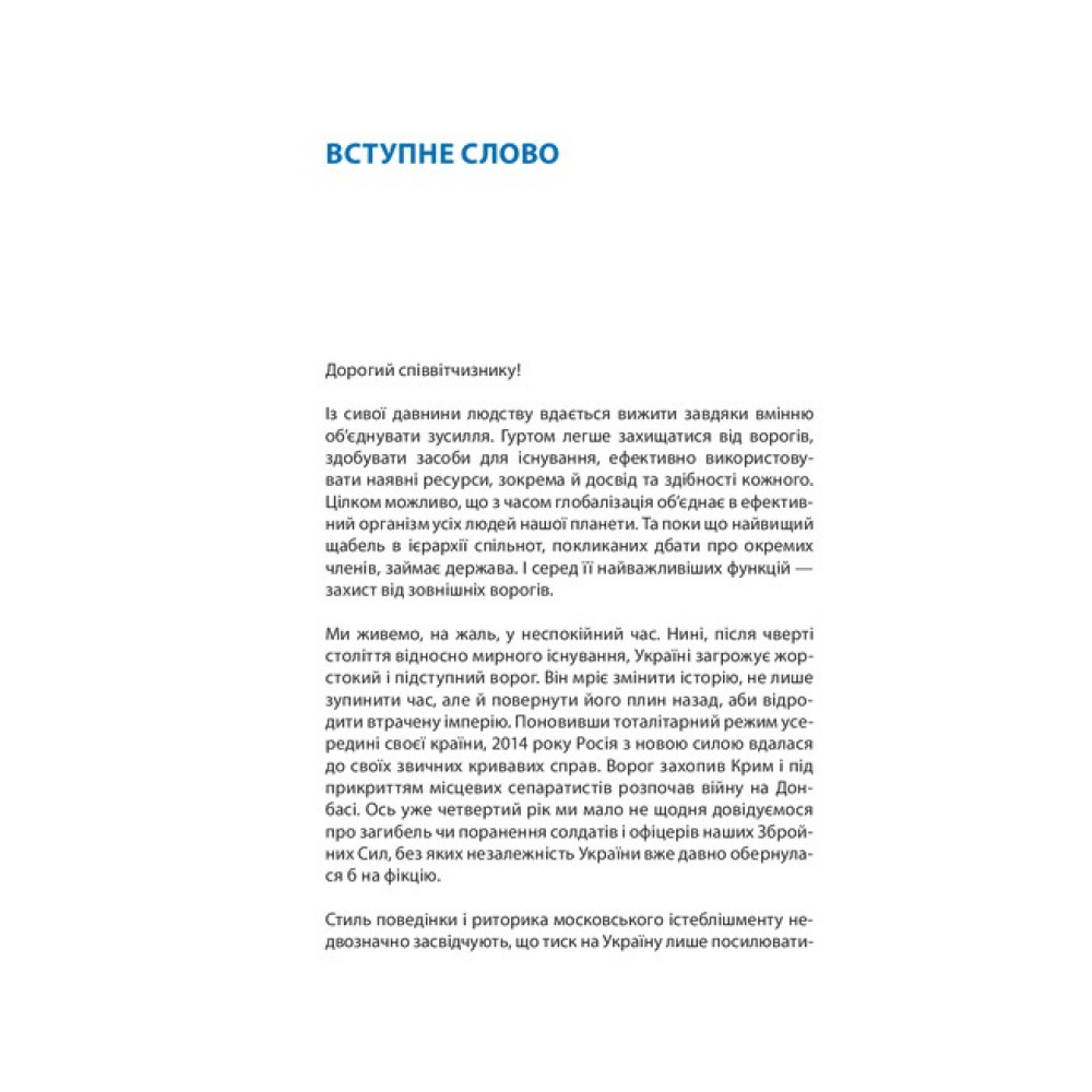 Сучасна війна — виклик не лише для збройних сил, а й для суспільства загалом та кожного його члена зокрема. Вона може охопити значну територію та кожної миті зазирнути в наш дім. В умовах бойових дій доведеться навчитися виживати за цих незвичних обставин. Набутий упродовж тисячоліть досвід показує, що людина спроможна справитися з надскладними обставинами, якщо заздалегідь підготується до них.