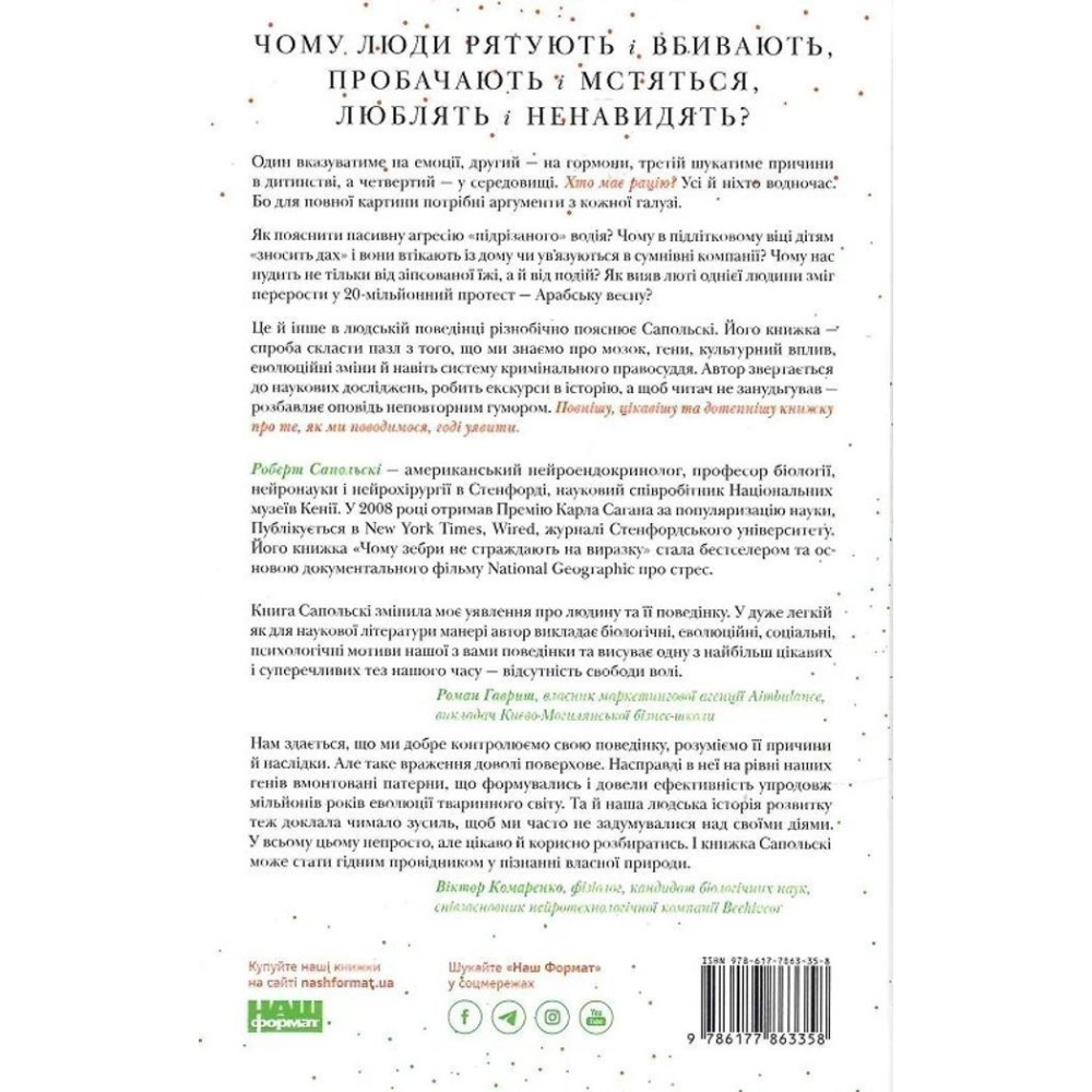 Як пояснити пасивну агресію «підрізаного» водія? Чому в підлітковому віці дітям «зносить дах» і вони втікають із дому чи ув’язуються в сумнівні компанії? Чому нас нудить не тільки від зіпсованої їжі, а й від подій? Як вияв люті однієї людини зміг перерости у 20-мільйонний протест — Арабську весну? Це й інше в людській поведінці різнобічно пояснює Роберт М. Сапольскі на сторінках книги «Біологія поведінки. Причини доброго і поганого в нас».