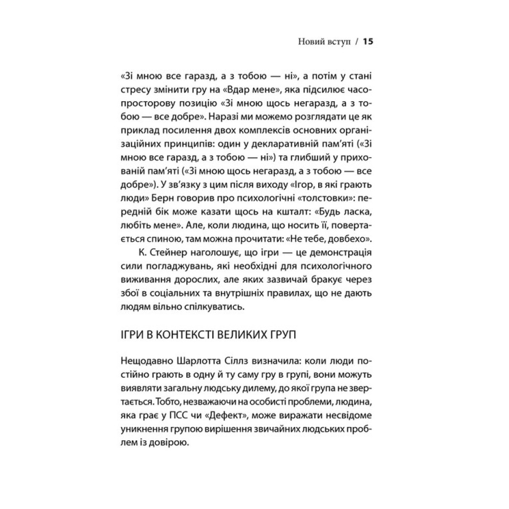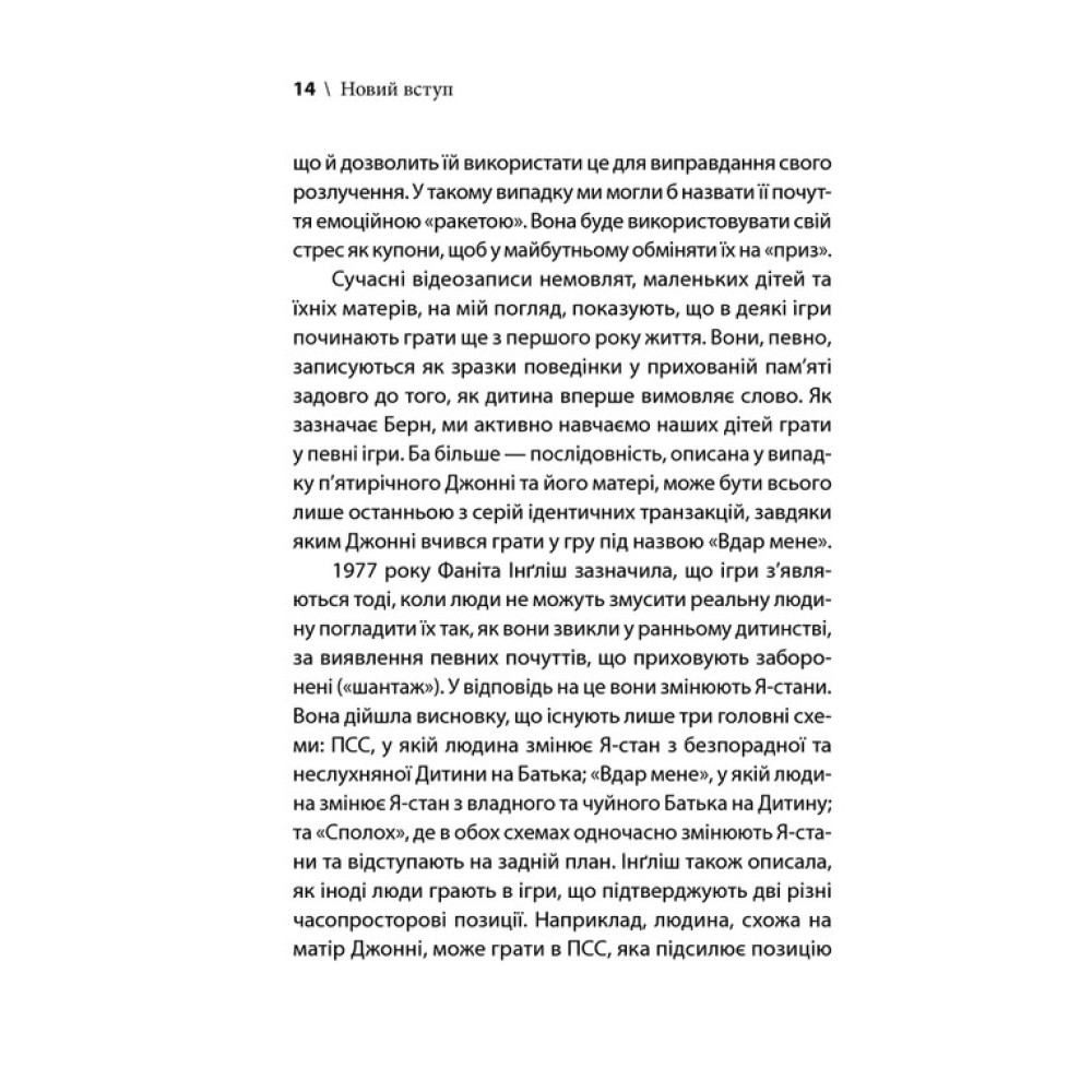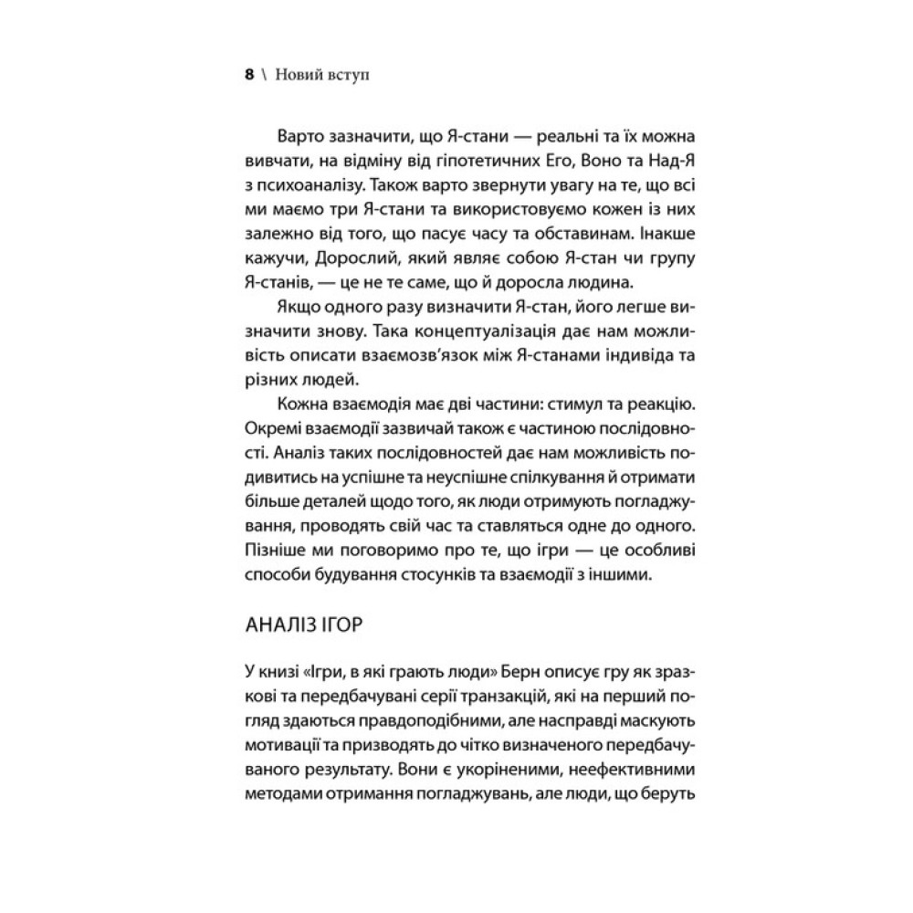 Книга Еріка Берна «Ігри, у які грають люди» пропонує детальний опис понад 120 ігор, у які ми граємо самі та у які нас залучають навколишні, а також дає поради для тих, хто хоче навчитись протистояти прийомам ігор, у які вас намагаються втягнути. Доктор Берн допомагає проаналізувати нюанси поведінки, позбавитись стереотипів у спілкуванні й дає розуміння сутності людських вчинків.