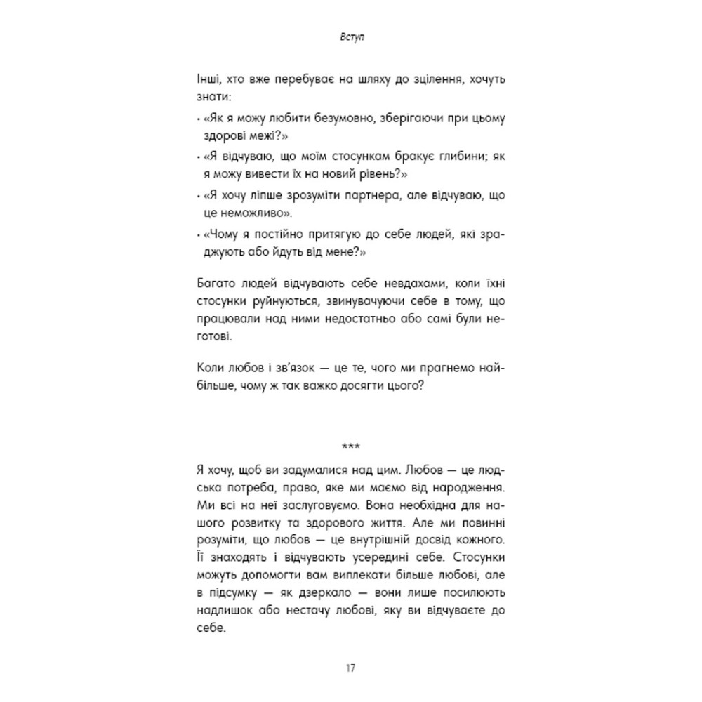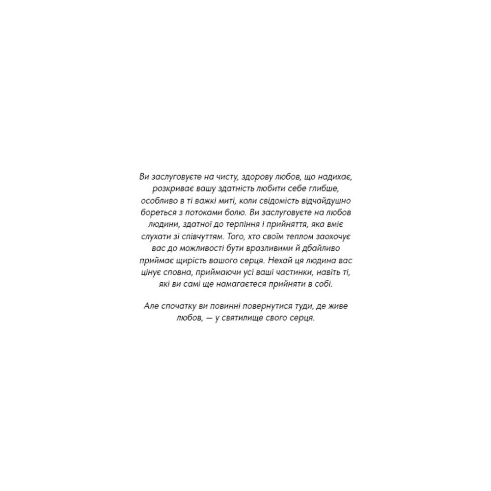 Автор поєднує психологічні знання з духовними практиками, простими порадами та рефлексійними вправами. Це робить книгу доступною і водночас глибокою — для тих, хто прагне зрозуміти себе краще й навчитися будувати справжні, здорові, теплі стосунки.