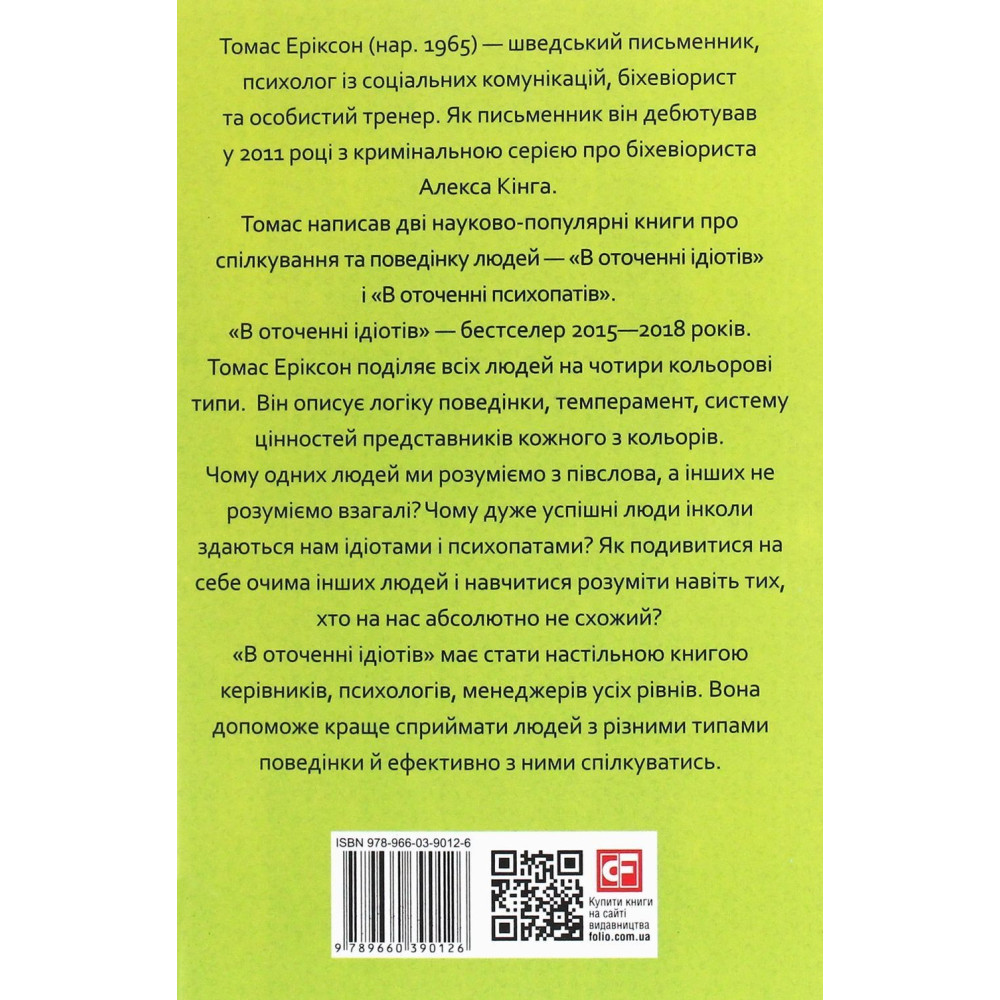 В оточенні ідіотів, або Як зрозуміти тих, кого неможливо зрозуміти» — бестселер 2015-2018 років. Томас Еріксон поділяє людей на чотири кольорові типи. Він описує логіку поведінки, темперамент, систему цінностей представників кожного з кольорів. Чому одних людей ми розуміємо з півслова, а інших не розуміємо взагалі? Чому дуже успішні люди інколи здаються нам ідіотами і психопатами? Як подивитися на себе очима інших людей і навчитися розуміти навіть тих, хто на нас абсолютно не схожий?