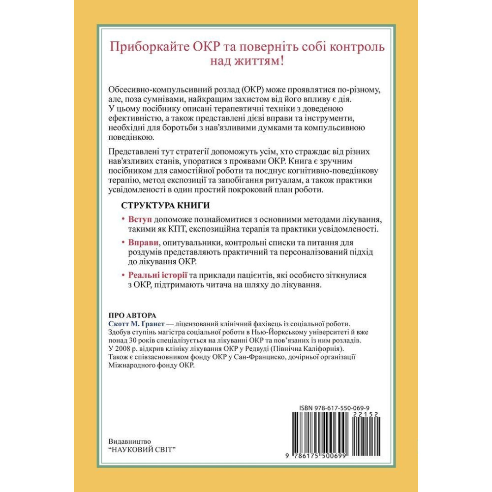 У посібнику «ОКР: Робочий зошит. Як позбутися нав’язливих думок та компульсивної поведінки. Покрокова інструкція» за авторством Скотта М. Ґранета описані терапевтичні техніки з доведеною ефективністю, а також представлені дієві вправи та інструменти, необхідні для боротьби з нав’язливими думками та компульсивною поведінкою.