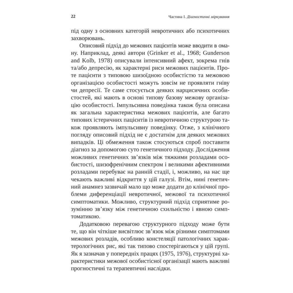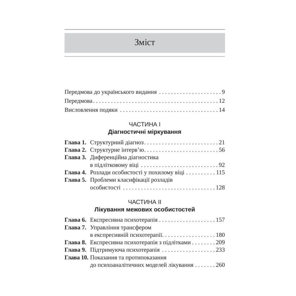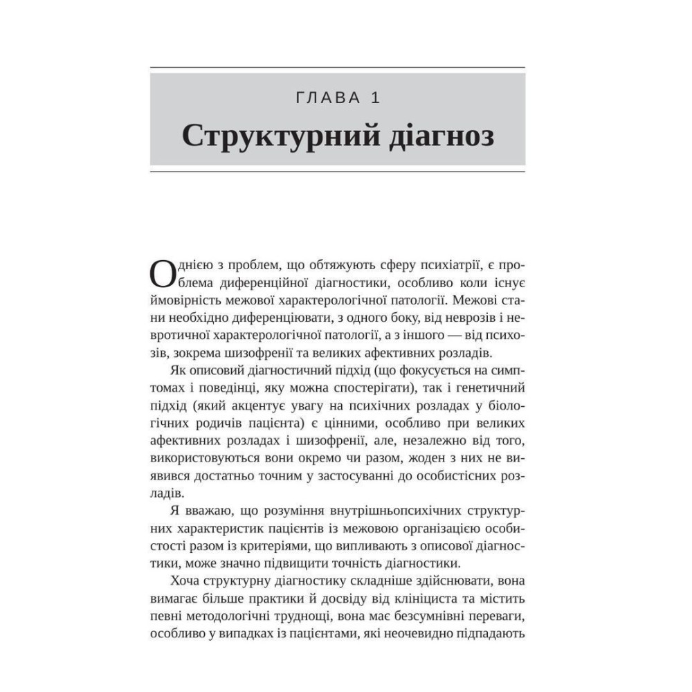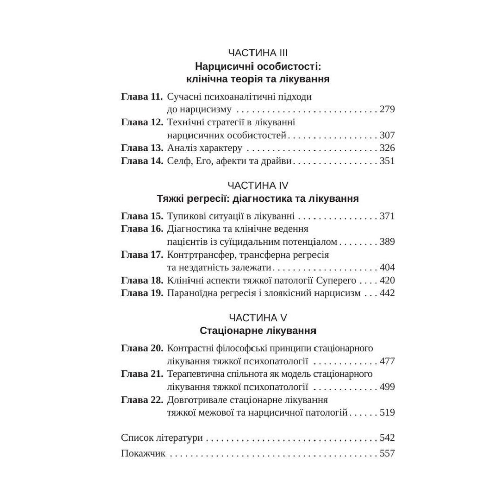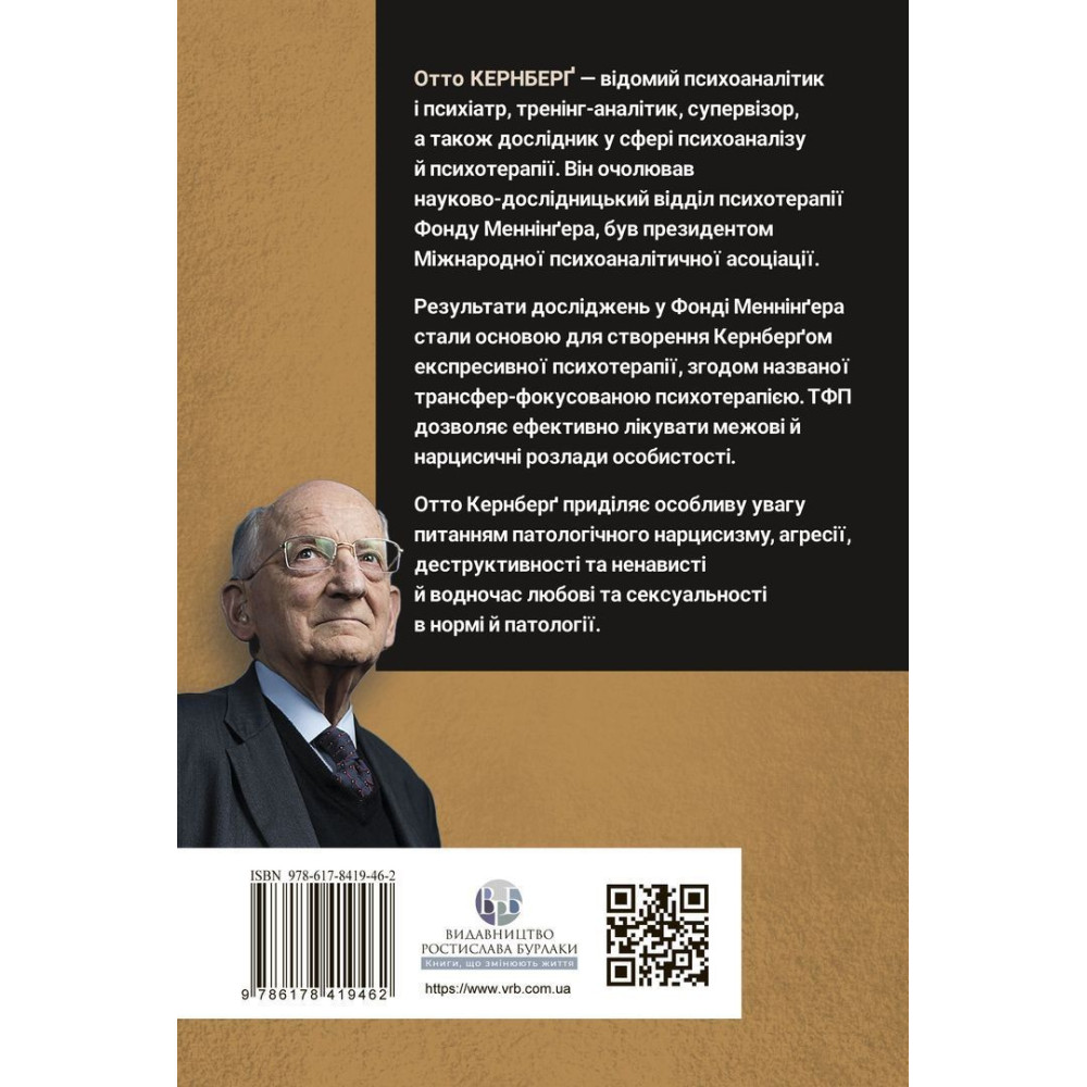Доктор Кернберґ не лише описує методи, які він вважає корисними в клінічній практиці, а й надає фахівцям дієві інструменти для діагностики та лікування складних випадків розладу особистості, включно з тяжкими межовими й нарцисичними патологіями; допомагає впоратися навіть у тупикових ситуаціях і визначитися, чи потрібна пацієнту госпіталізація.