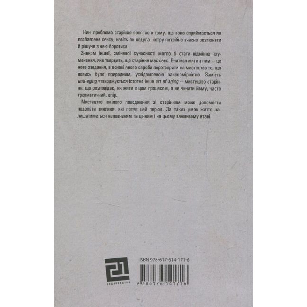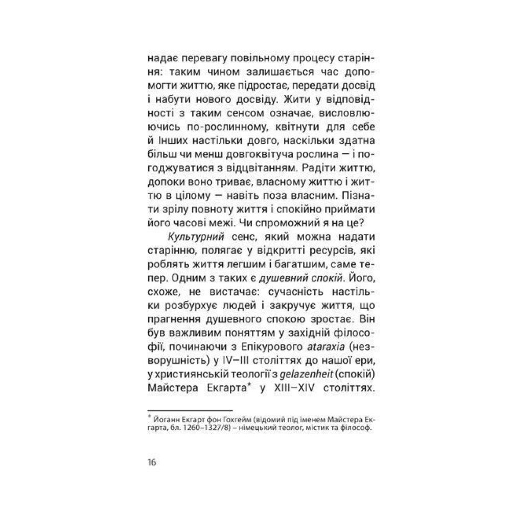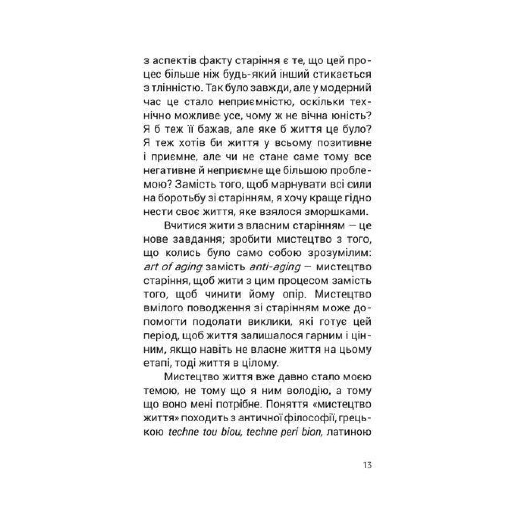 Ведучи мову на непросту тему старіння, Вільгельм Шмід дуже просто, зрозуміло, толерантно і водночас чесно розмірковує про цей неминучий і закономірний процес. Він пропонує десять кроків до душевного спокою. Його книга читається, як хоку під супровід звуків японської флейти, води, вітру, бамбукових дзвоників у японському саду, падіння листя дерев на водну поверхню. Це мистецтво старіння — мистецтво вмілого поводження з похилим віком.