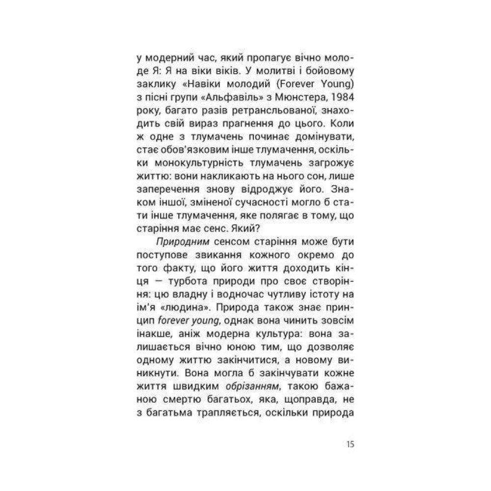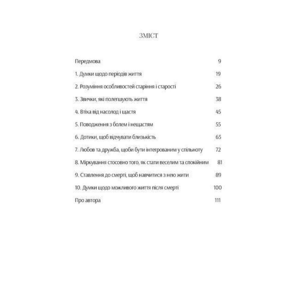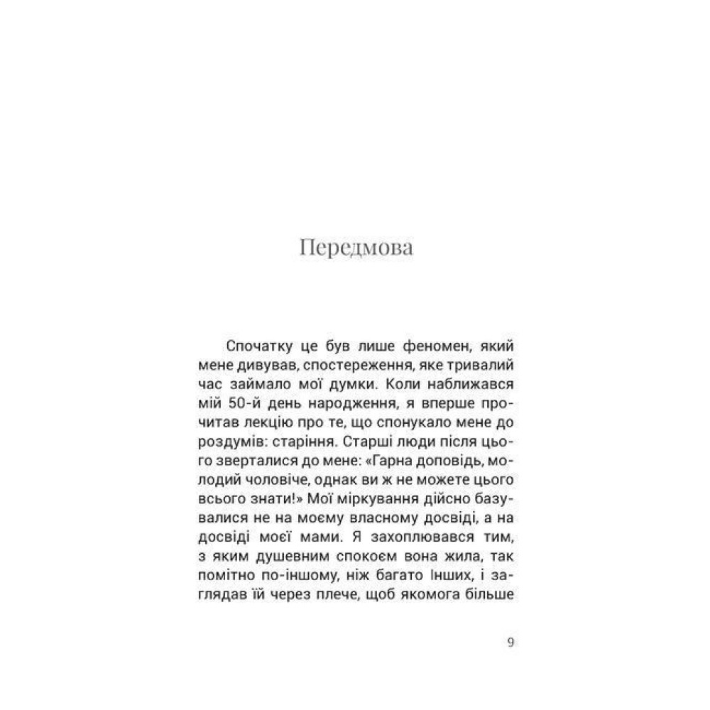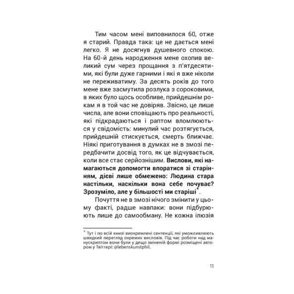 Ведучи мову на непросту тему старіння, Вільгельм Шмід дуже просто, зрозуміло, толерантно і водночас чесно розмірковує про цей неминучий і закономірний процес. Він пропонує десять кроків до душевного спокою. Його книга читається, як хоку під супровід звуків японської флейти, води, вітру, бамбукових дзвоників у японському саду, падіння листя дерев на водну поверхню. Це мистецтво старіння — мистецтво вмілого поводження з похилим віком.