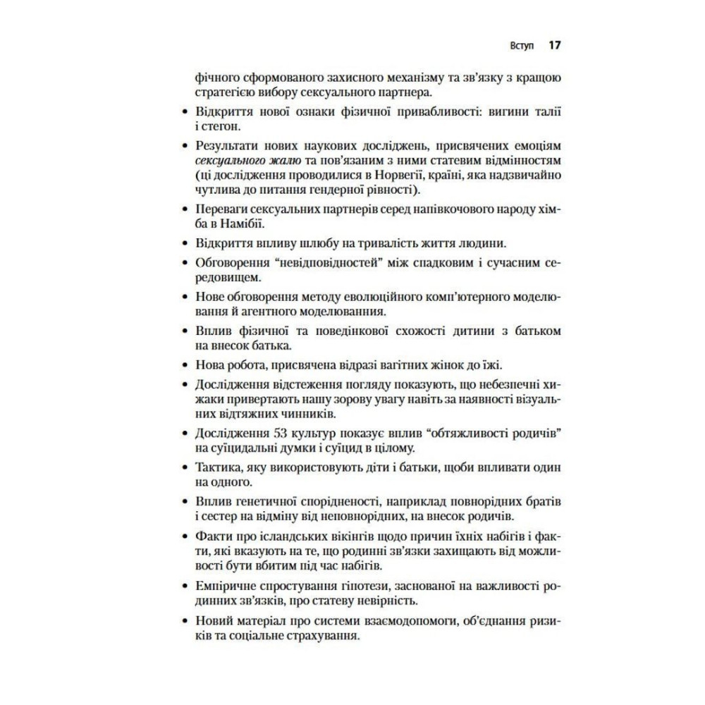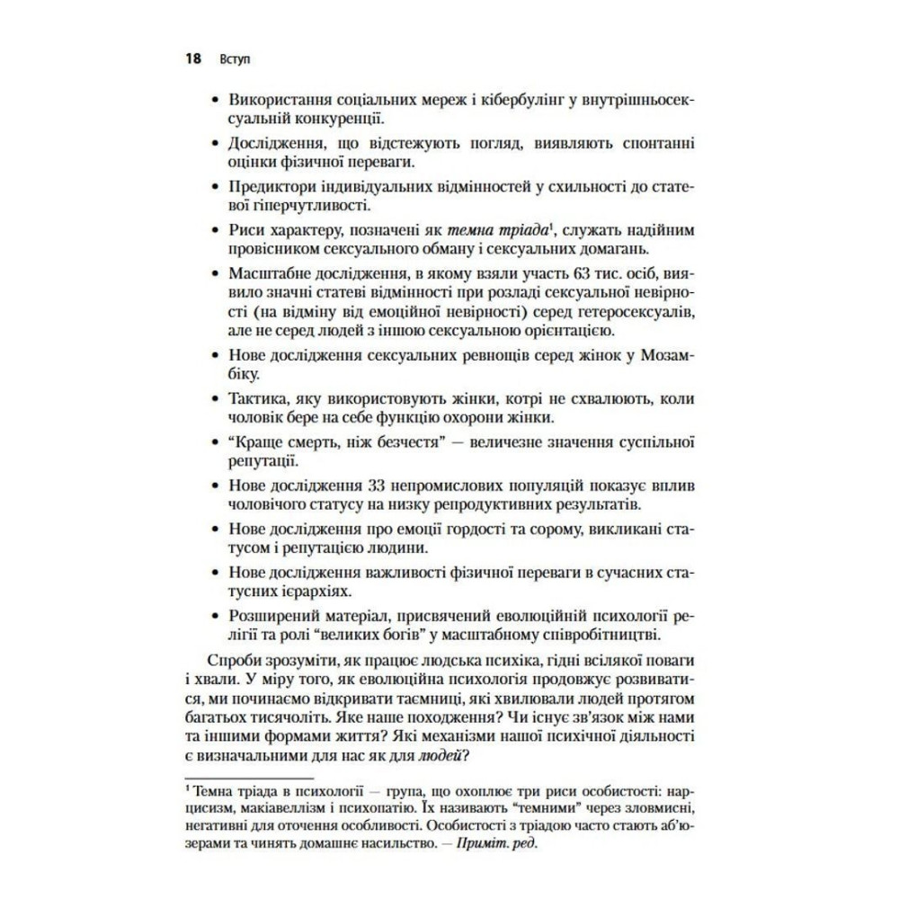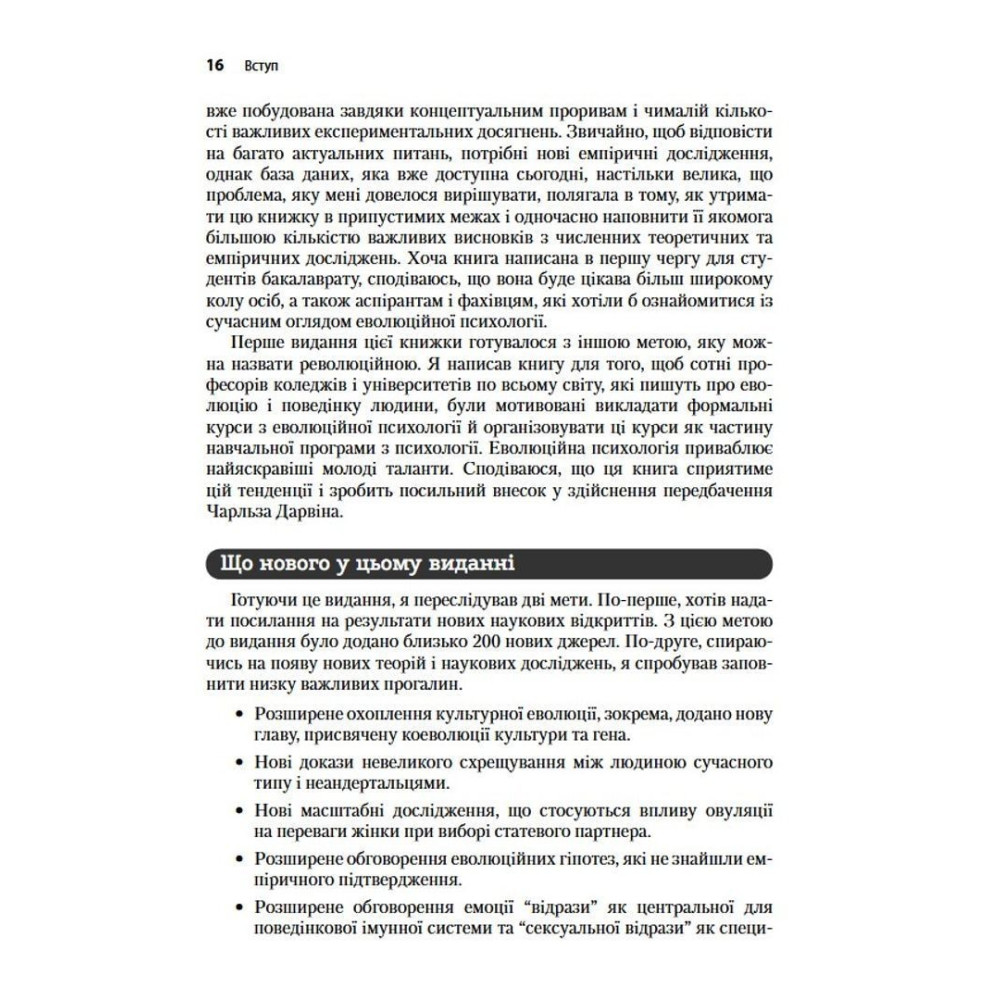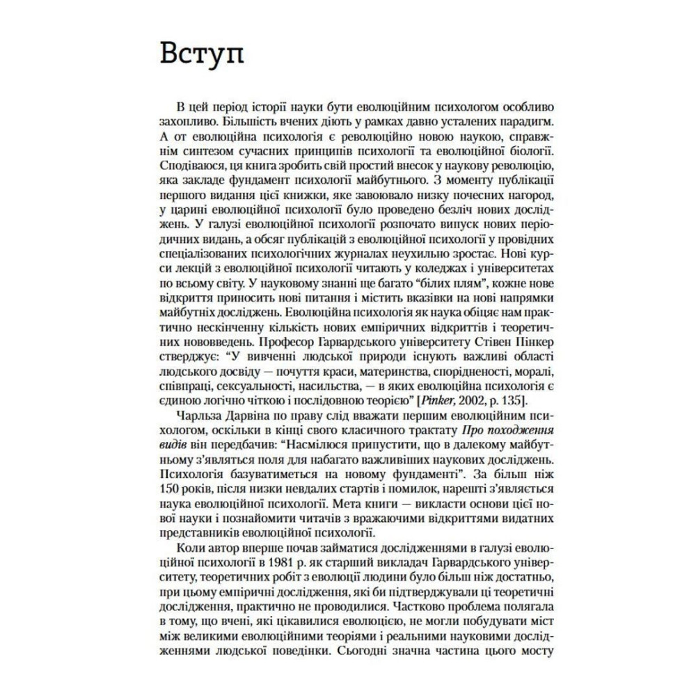 У книзі «Еволюційна психологія: Нова наука про людську психіку. Том 1. Основи» за авторством Девіда М. Басса висвітлюються теорії культурної та біокультурної еволюції, еволюційні гіпотези, які були емпірично спростовані, та багато іншого. Автор використовує велику кількість педагогічних прийомів, які сприяють розвитку критичного мислення, а також наводить численні приклади, що наочно демонструють, як застосовувати еволюційну психологію в реальних життєвих ситуаціях.