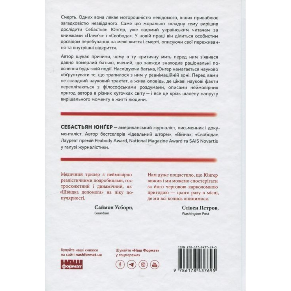 Смерть. Одних вона лякає моторошністю невідомого, інших приваблює загадковістю незвіданого. Саме цю морально складну тему вирішив дослідити Себастьян Юнґер, уже відомий українським читачам за книжками «Плем’я» і «Свобода». У новій праці «Коли я помирав. Роздуми скептика про ймовірність потойбічного життя» він ділиться особистим досвідом перебування на межі життя і смерті, описуючи свої переживання та внутрішні відкриття.
