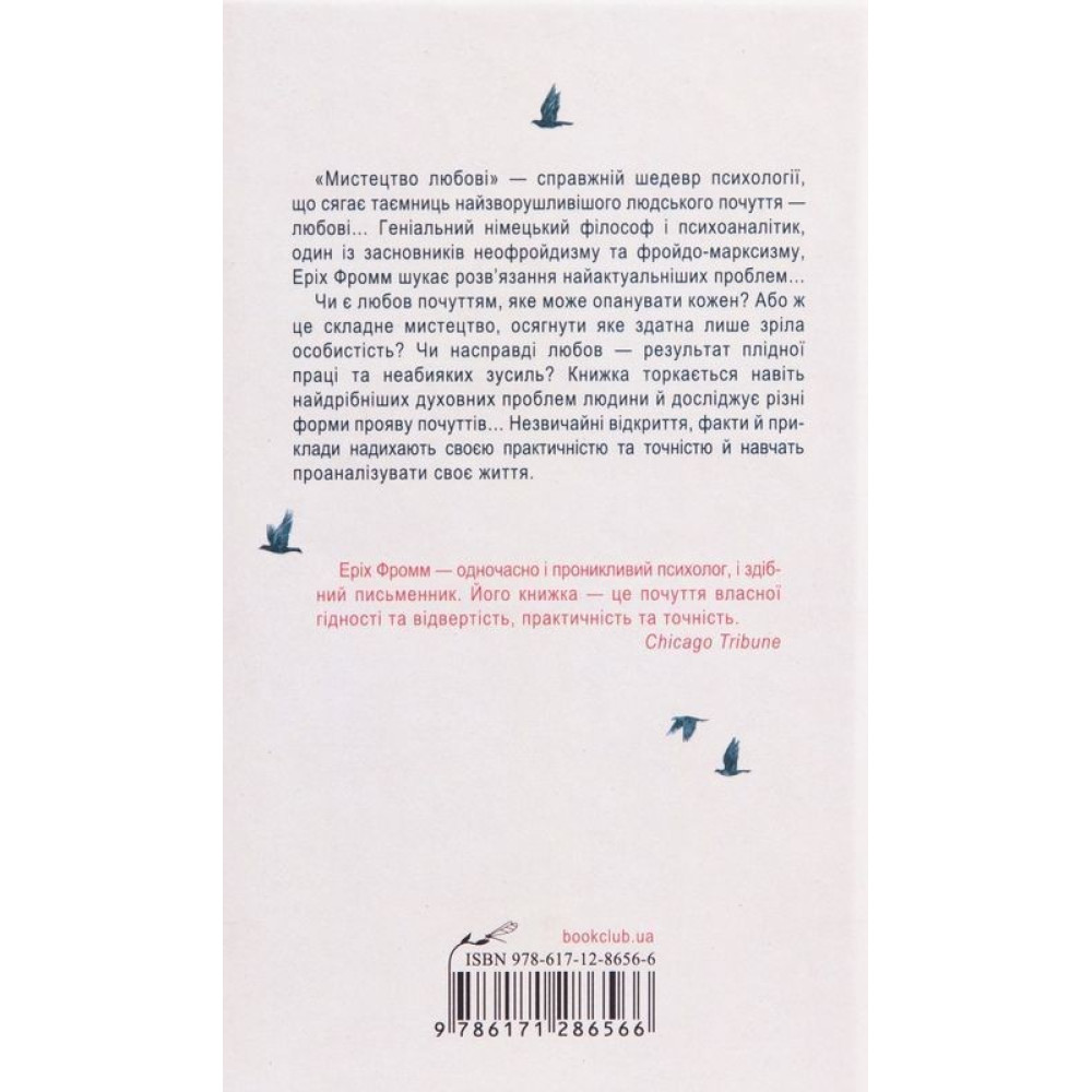 «Мистецтво любові» — справжній шедевр психології, що сягає таємниць найзворушливішого людського почуття — любові... Геніальний німецький філософ і психоаналітик, один із засновників неофрейдизму та фройдо-марксизму Еріх Фромм шукає рішення найактуальніших проблем...