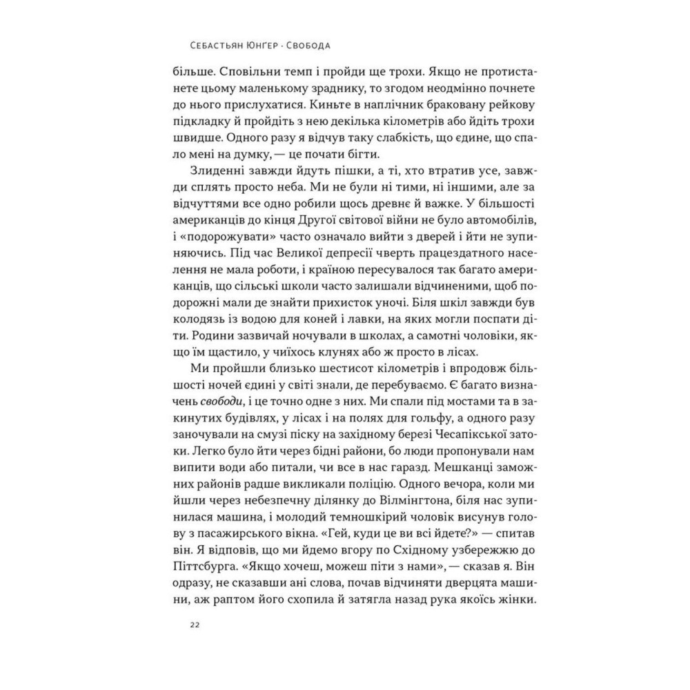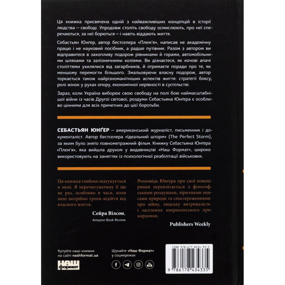 Себастьян Юнґер, автор бестселера «Плем’я», написав не академічну працю і не науковий посібник, а радше путівник, який має символічну назву «Свобода». Разом з автором ви відправитеся в захопливу подорож рівнинами й горами, автомобільними шляхами та залізничними коліями. Ви дізнаєтеся, як кочові апачі століттями ухилялися від загарбників, й отримаєте поради про те, як меншому перемогти більшого. Змальовуючи власну подорож, автор торкається також найрізноманітніших аспектів життя: стратегії боксу, ролі жінок у рухах опору, економічної нерівності в суспільстві.