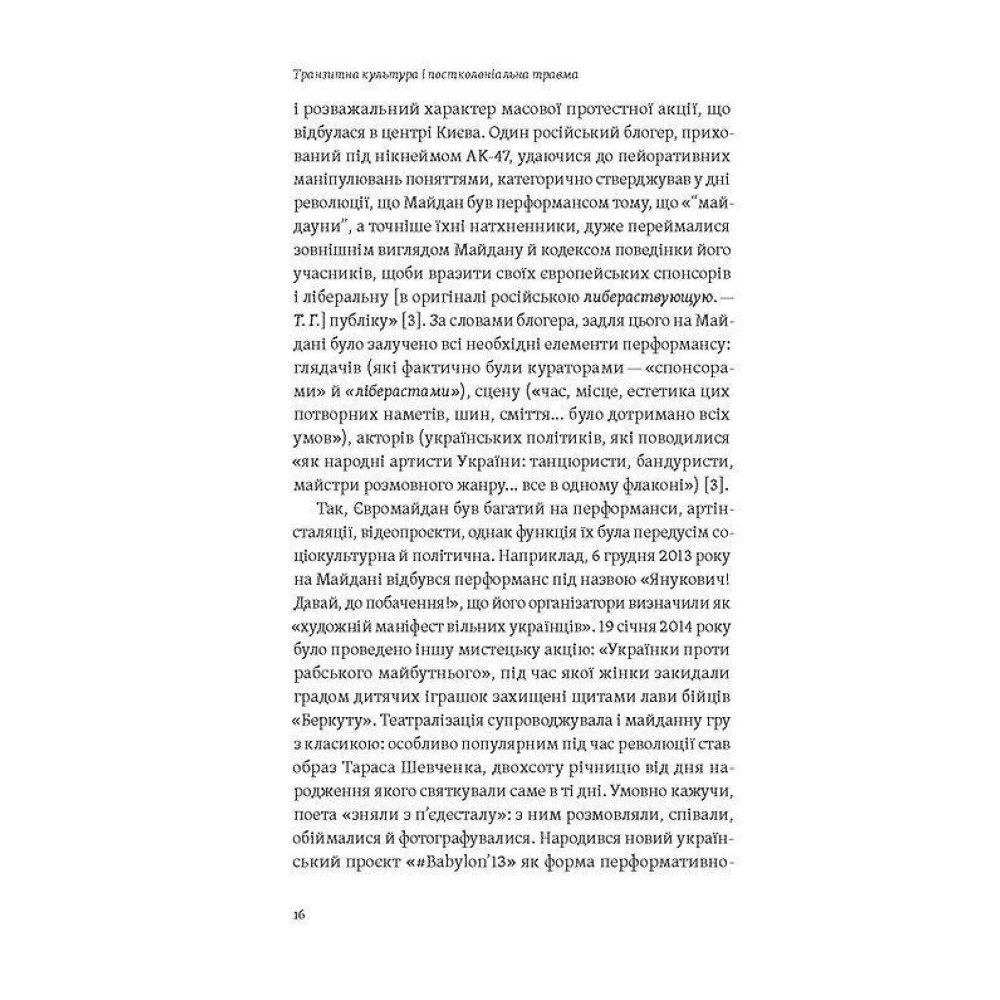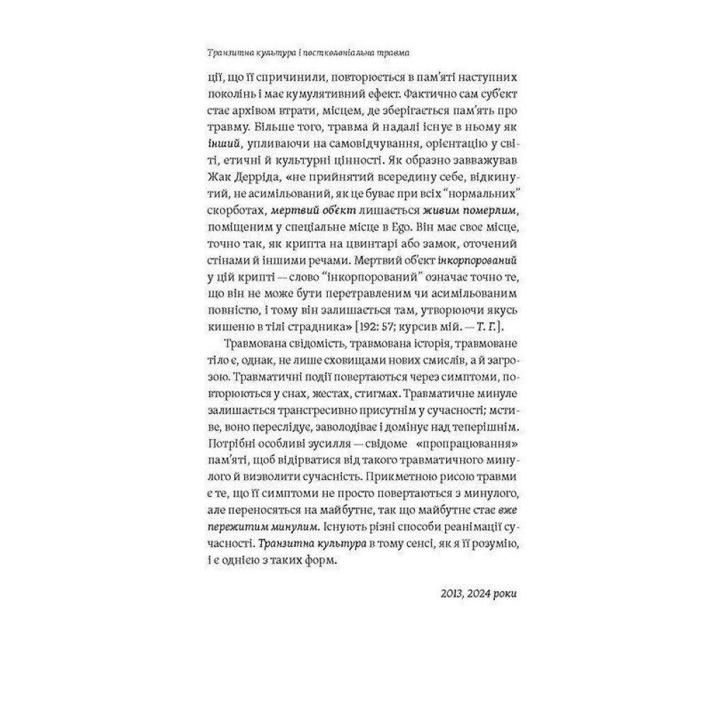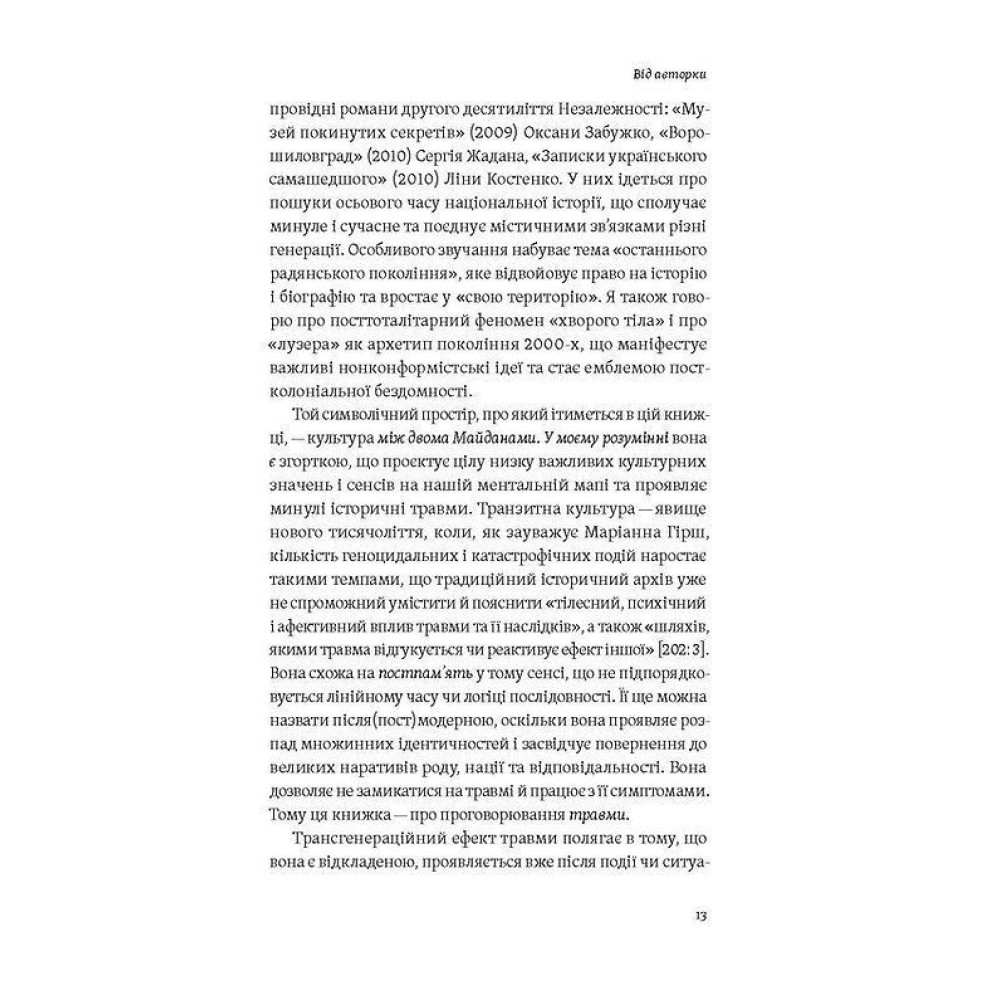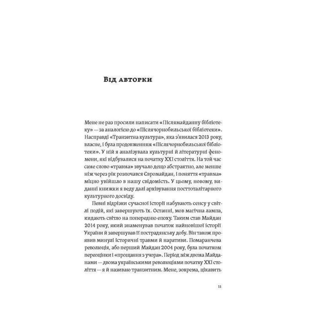 Романи Сергія Жадана, Оксани Забужко та Ліни Костенко стали знаковими творами української літератури початку 2000-х. У книжці «Транзитна культура і постколоніальна травма» Тамара Гундорова аналізує їх та низку інших символічних текстів і явищ культури між двома Майданами через призму трьох основних тем: постколоніальної травми, посттоталітарної свідомості та постпам’яті.