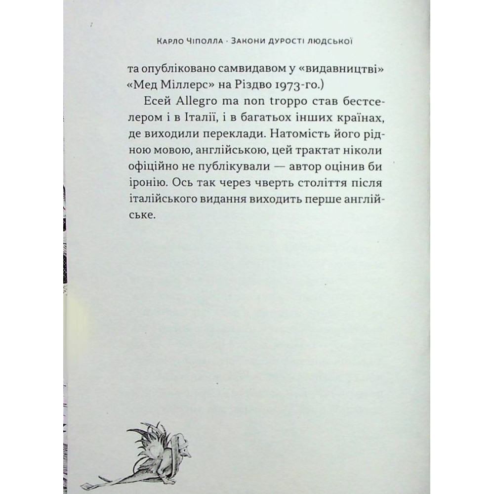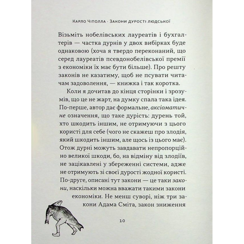 Може здатися, що книжка Карло Чіполли «Закони дурості людської» — це жарт, але ні: це жодною мірою не продукт цинізму чи прояв капітулянтських настроїв. Більш того, це конструктивна спроба визначити, зрозуміти й, можливо, нейтралізувати одну з найпотужніших і найтемніших сил, що заважають щастю й добробуту людства, — дурість.