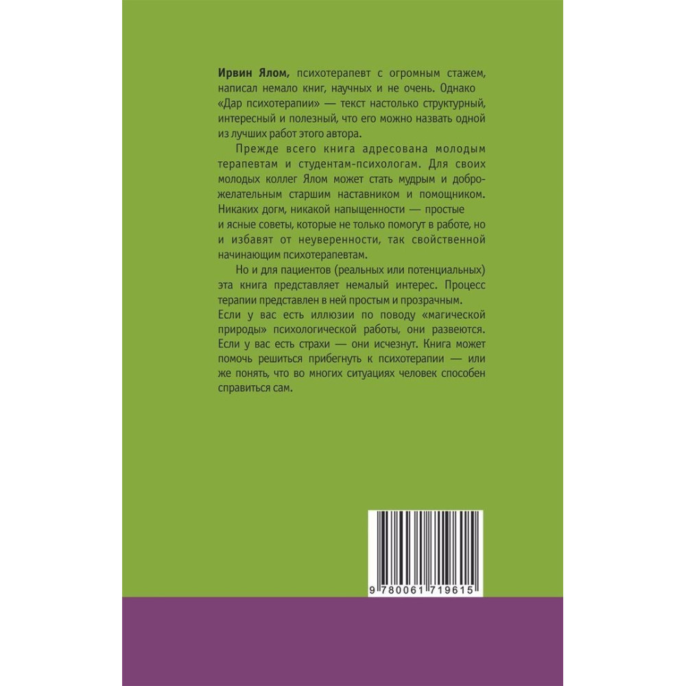 Жодних догм чи пихатості праця доктора Ірвіна Ялома «Дар психотерапии. Психотерапевтические истории» не має — лише прості та зрозумілі поради, які не тільки допоможуть у роботі, а й позбавлять невпевненості, що так властива психотерапевтам-початківцям. Але і для пацієнтів (реальних або потенційних) ця книга представляє чималий інтерес.