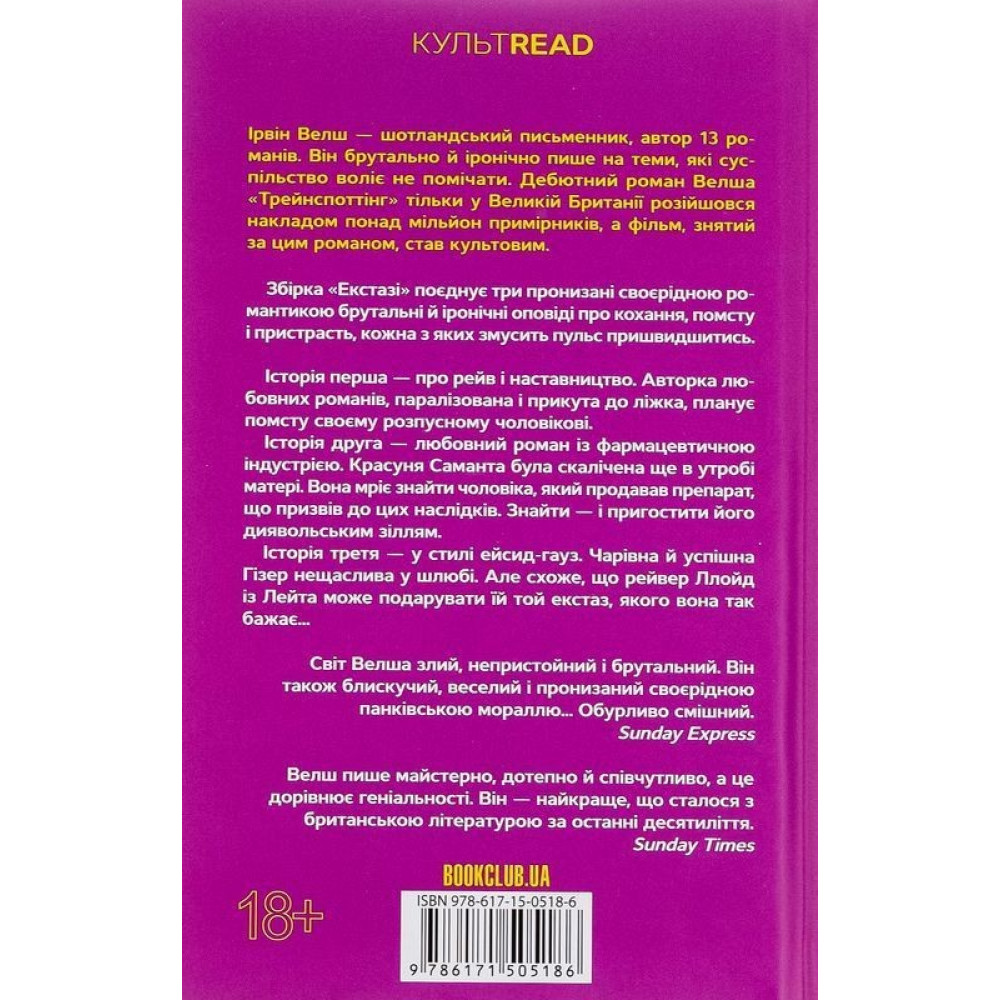 Збірка «Екстазі» за авторством Ірвіна Велша поєднує три пронизані своєрідною романтикою брутальні й іронічні оповіді про кохання, помсту й пристрасть, кожна з яких змусить тиск підвищитися.