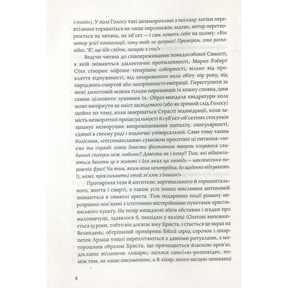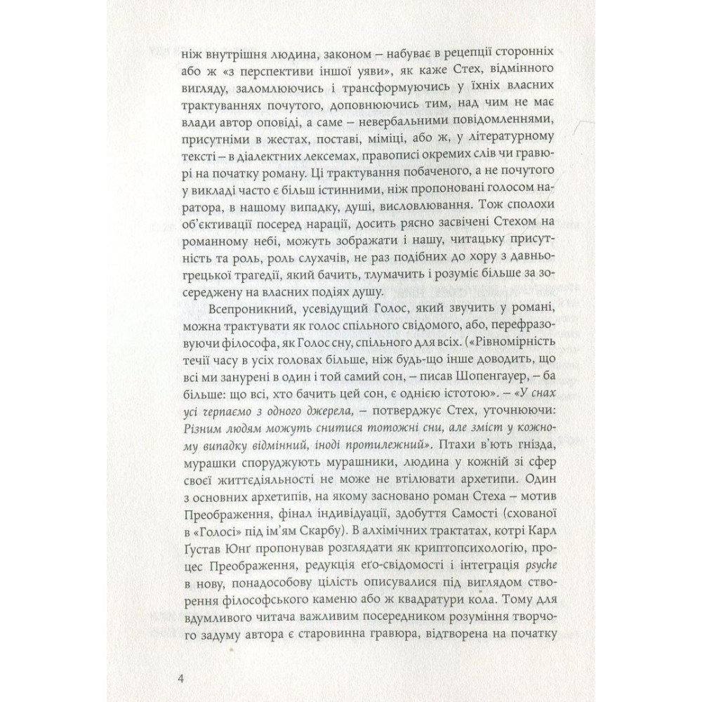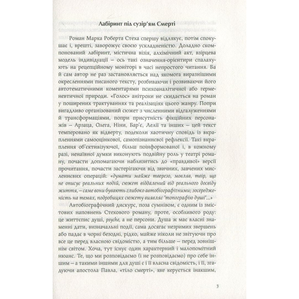 «Альхемічний» роман «Голос» українського письменника і культуролога з Канади Марко Роберта Стеха розгортається із оповіді про Олега — молоду й нібито пересічну людину, яка несподівано змушена покинути своє рутинне життя й вирушити на пошуки напівзнайомого чоловіка, який зник за нез’ясованих обставин. Єдиний слід, який та загублена людина лишила за собою, — це розрізнені уривки складного незавершеного роману. Шукаючи слідів на основі тих незрозумілих записів, Олег нарешті вражено усвідомлює, що цей ефемерний текст чужої людини метафорично описує не що інше, як його власне життя: минуле й розписане наперед майбутнє...