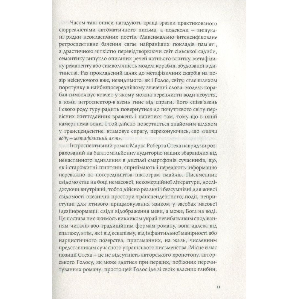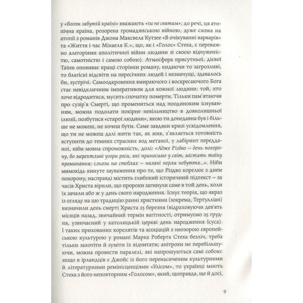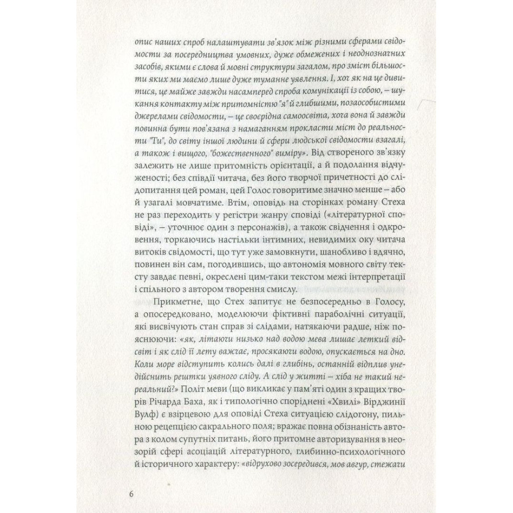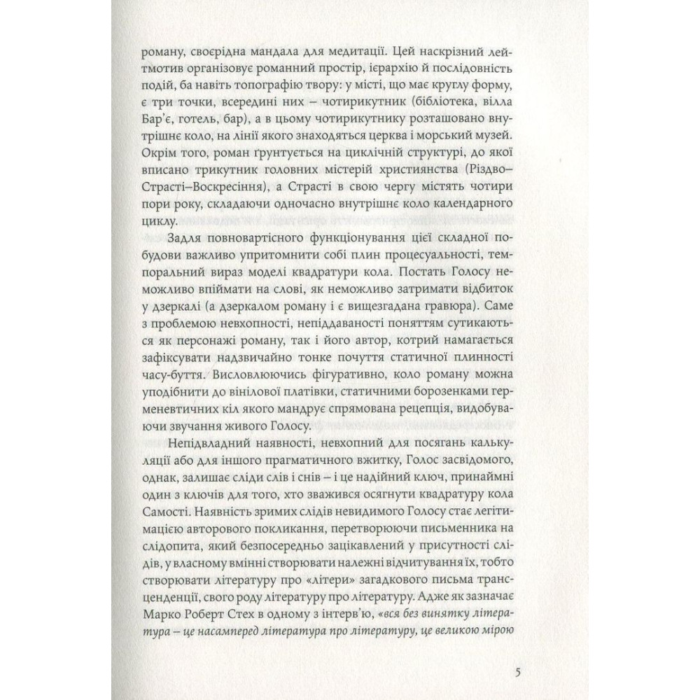 «Альхемічний» роман «Голос» українського письменника і культуролога з Канади Марко Роберта Стеха розгортається із оповіді про Олега — молоду й нібито пересічну людину, яка несподівано змушена покинути своє рутинне життя й вирушити на пошуки напівзнайомого чоловіка, який зник за нез’ясованих обставин. Єдиний слід, який та загублена людина лишила за собою, — це розрізнені уривки складного незавершеного роману. Шукаючи слідів на основі тих незрозумілих записів, Олег нарешті вражено усвідомлює, що цей ефемерний текст чужої людини метафорично описує не що інше, як його власне життя: минуле й розписане наперед майбутнє...
