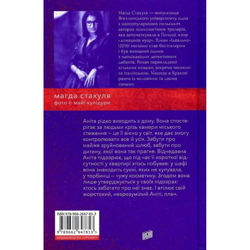 Аніта, головна героїня книги Магди Стахулі «Ідеальна», рідко виходить з дому: вона спостерігає за людьми крізь камери міського стеження — це її вікно у світ, яке дає змогу контролювати все й усіх. Забути про майже зруйнований шлюб, забути про дитину, якої вона так прагне.