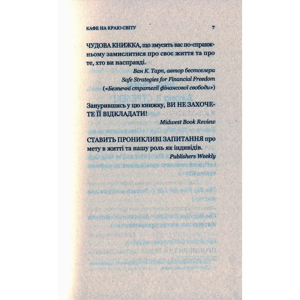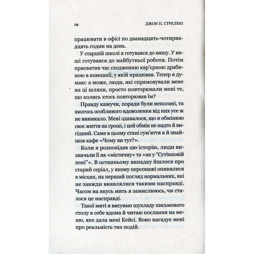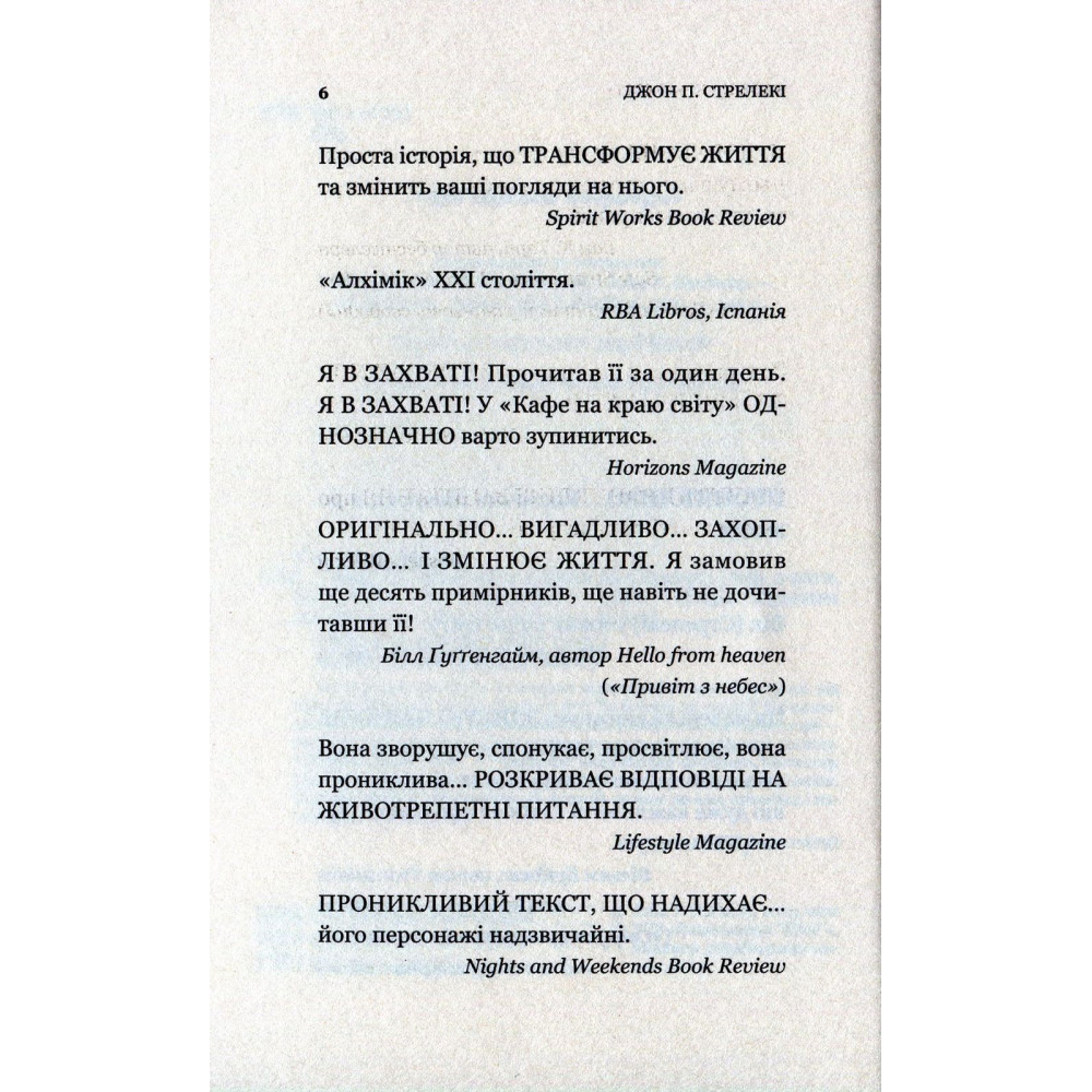 Книжка Джона П. Стрелекі «Кафе на краю світу» допоможе у пошуках відповідей. З нею ви запалите вогонь у душі, усвідомите, що цінне, а що — марнота, поглянете на життя під іншим кутом зору, незалежно від набутого досвіду.