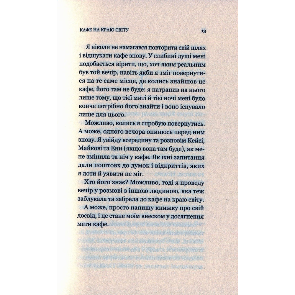 Зупиніться. Поставте на паузу щоденну метушню, вирвіться з її тенет і зазирніть до кафе на краю світу. Розгорніть меню й придивіться уважніше до останньої сторінки — там ви прочитаєте три запитання, від яких тікали все життя. Чому ви тут? Чи боїтеся ви смерті? Чи вдоволені ви?