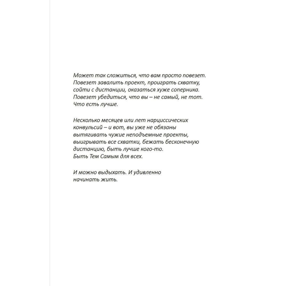 Декілька місяців або років нарцисичних конвульсій — і ось, ви вже не зобов'язані витягувати чужі непідйомні проекти, вигравати всі сутички, бігти нескінченну дистанцію, бути краще за когось. Бути Тим Самим для всіх.