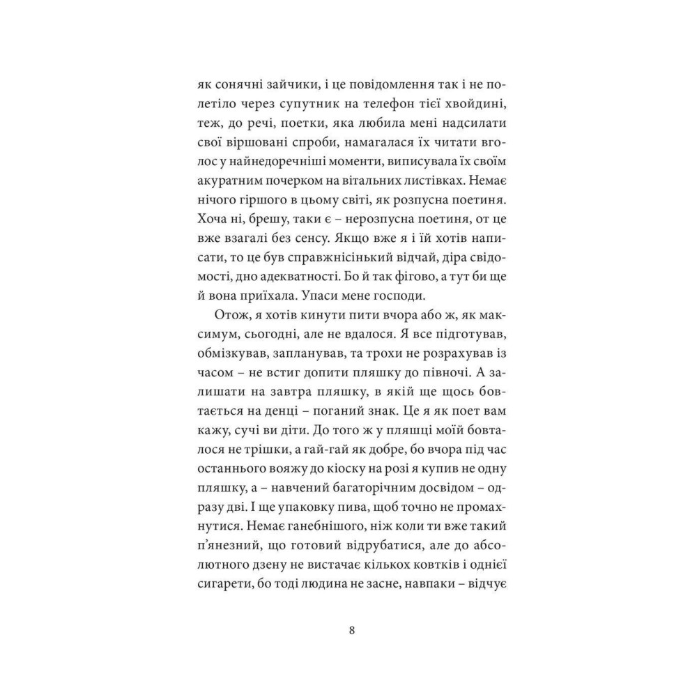 У пошуках відповіді герой занурюється в абсурдні ситуації, де поруч з’являються вірний друг Паша, поліція та навіть кровожерні гуцули. Роман балансує між сатирою й саморефлексією, грайливо обігрує фройдистські мотиви й сміливо кепкує з літературних амбіцій, чоловічих страхів та міфів про «правильне» життя.