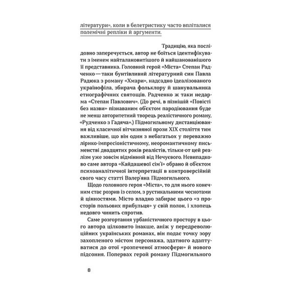 У найпростішому прочитанні роман «Місто» Валер’яна Підмогильного — це історія амбітного юнака, який переїжджає із села у Київ і будує там нове життя. Його часто порівнюють з героєм «Любого друга» Мопассана й самовпевненими і неперебірливими в засобах підкорювачами суспільних вершин із сюжетів Бальзака. Однак для Підмогильного це не лише історія кар’єри. Він уписує життя Степана Радченка в історико-культурний контекст тогочасної України.