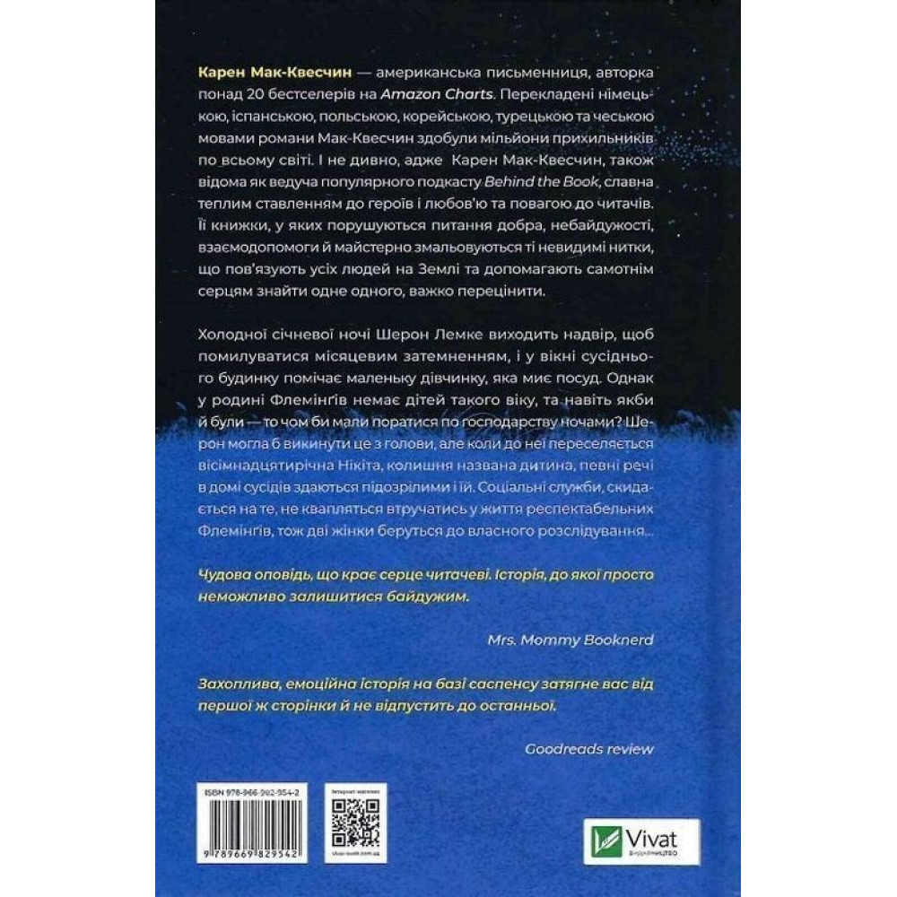 Карен Мак-Квесчин — письменниця, за плечима якої вже понад 20-и бестселерів, що перекладені 6-ма мовами, та мільйони прихильників по всьому світу, які особливо тепло відзначають її творчість й дещо унікальний стиль, який дає змогу її книгам відрізнятися від інших.