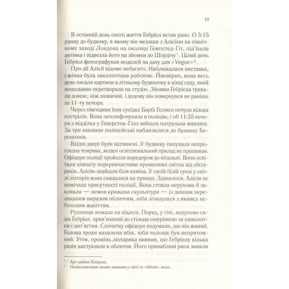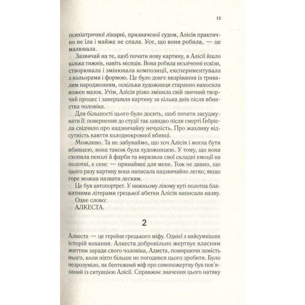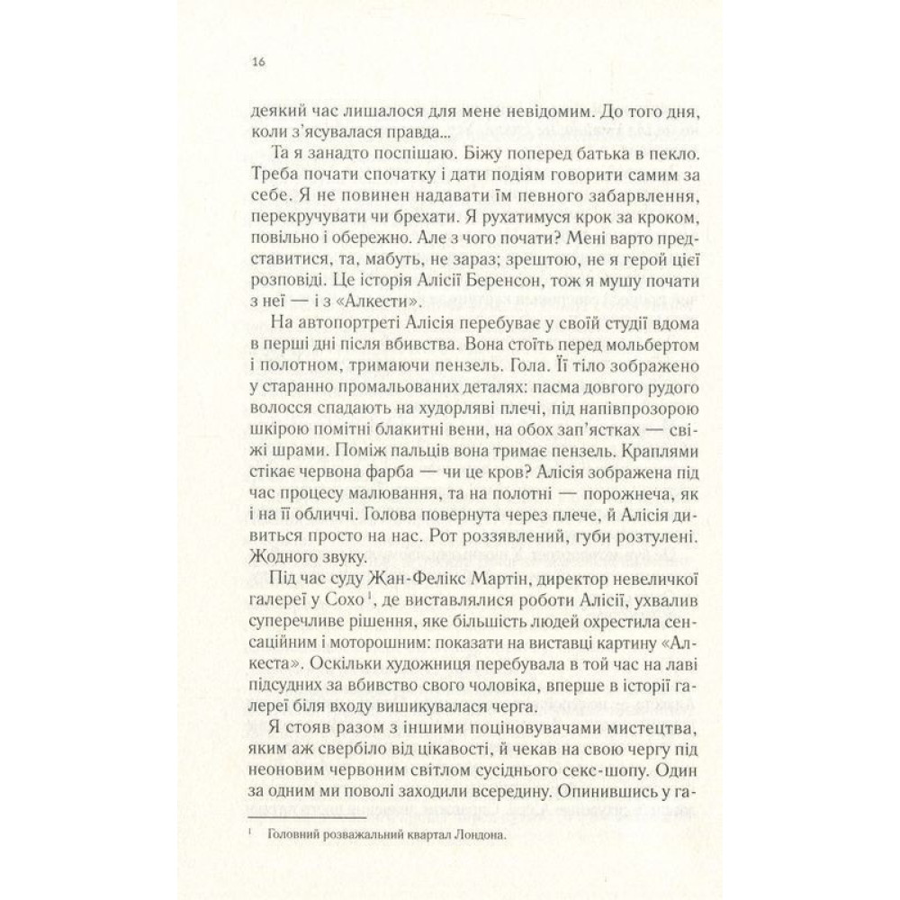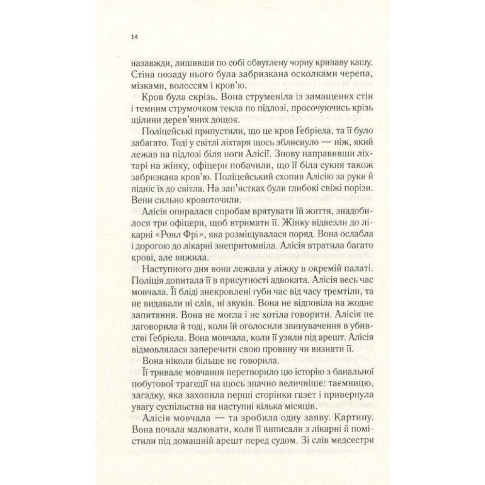 Відмова Алісії говорити й давати будь-які пояснення перетворює трагедію на щось набагато грандіозніше, ніж звичайний злочин, — на таємницю, яка захоплює уяву публіки й створює шалений попит на її картини. Ціна на роботи художниці стрімко зростає, а вона — мовчазна пацієнтка — роками ховається якомога далі від таблоїдів в безпечному й захищеному відділі судово-медичної експертизи. Але її мовчання не може тривати вічно. За справу береться кримінальний психотерапевт Тео Фабер, який впевнений, що змусить Алісію заговорити й розкриє її таємницю. Та чи дійсно він буде готовий почути правду?..