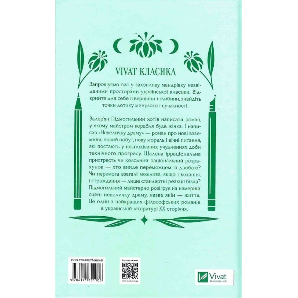 Один з найвидатніших українських письменників XX століття, Валер'ян Підмогильний представляє твір-прозу під назвою «Невеличка драма», події якої відбуваються в часи комуністичної радянської України 1920-х років, та розкриває життєвий побут з його жорстокими реаліями під владою радянського антилюдського режиму. В. Підмогильний, розповідаючи за допомогою тонкого психологізму й глибинних переживань історію кохання чоловіка й жінки, достовірно розкриває їхні мінливі й непрості характери, зрештою визначаючи сюжет своєї книги як екзистенційний з точки зору психології.