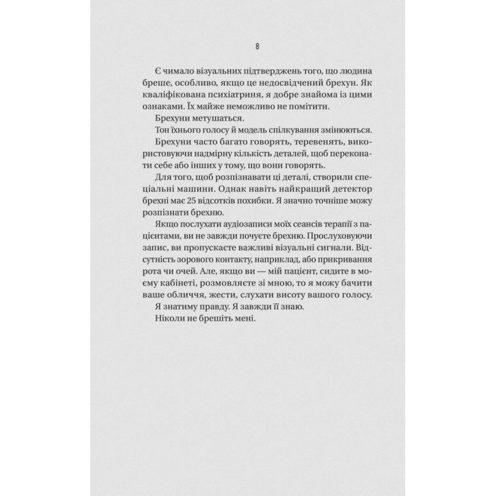 Романом «Ніколи не бреши» Фріда Мак-Фадден вчергове пропонує читачам історію, темп якої захоплює, а фінал залишає під невимовними враженнями.