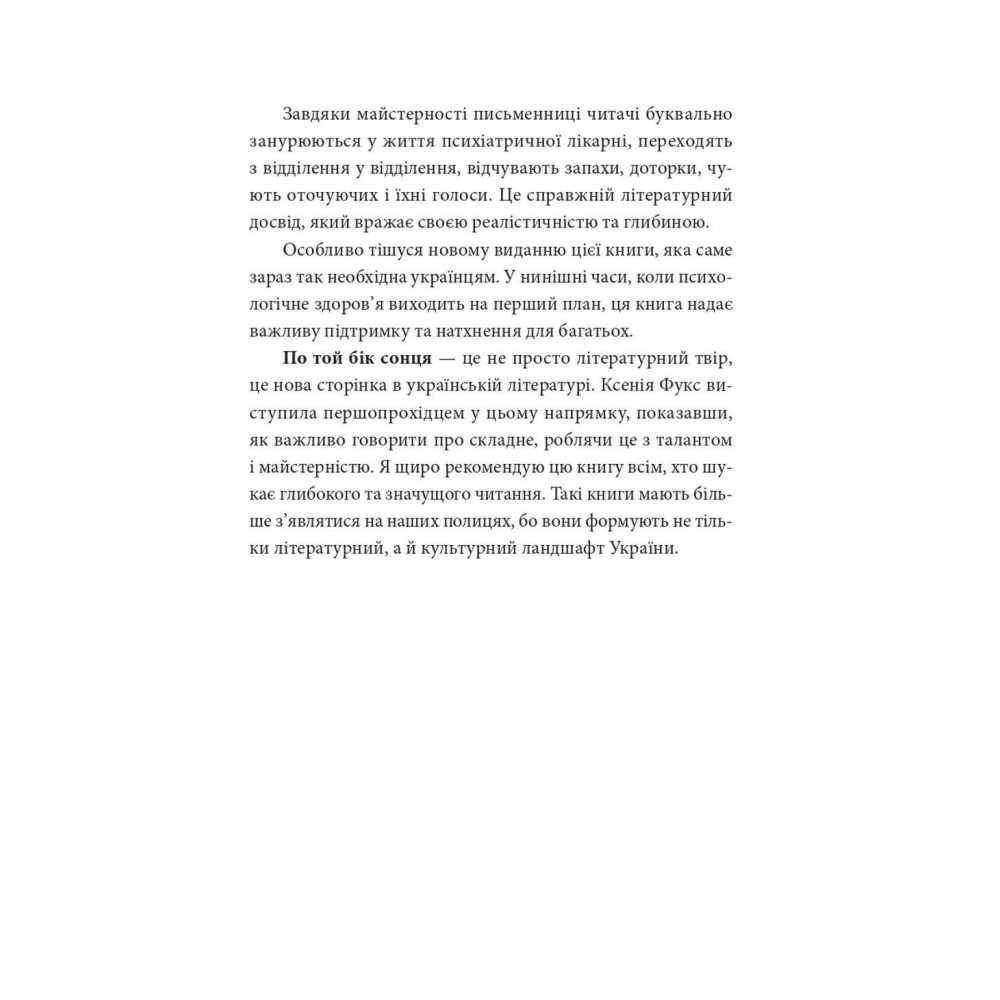 Головна героїня книги «По той бік сонця. Історія однієї самотності» від Ксенії Фукс опиняється межі та потрапляє до закритого відділення однієї з психіатричних клінік у Німеччині — місця, де суспільство ховає тих, хто не вписується у рамки «нормальності».
