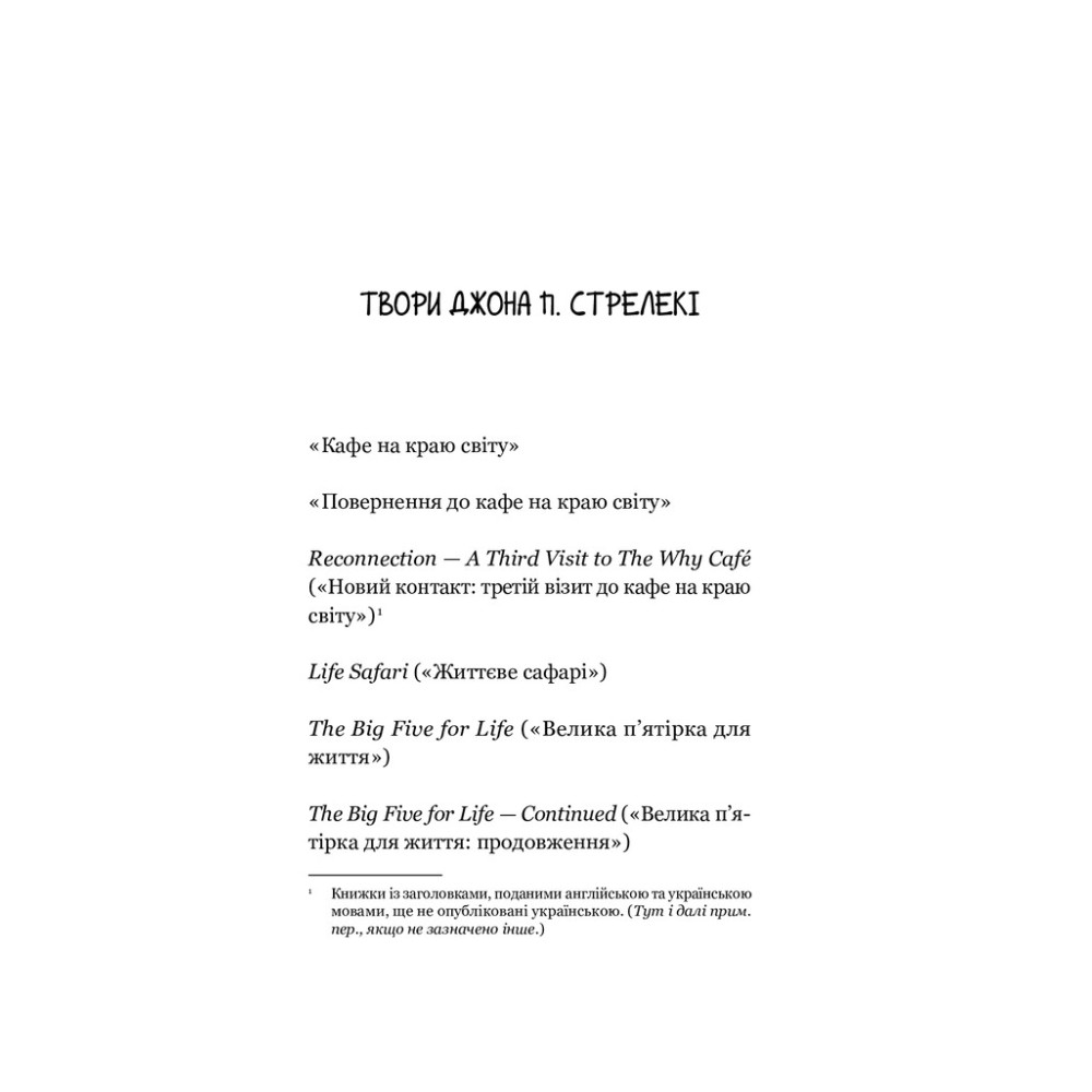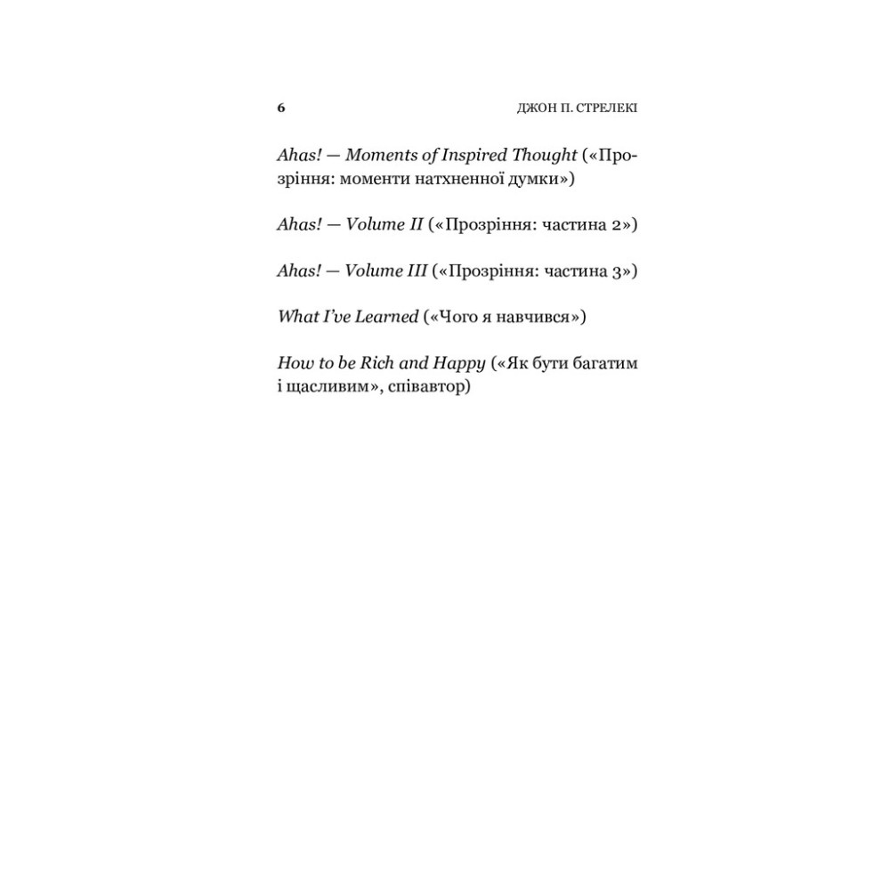 Джон П. Стрелекі — популярний американський письменник та автор кількох міжнародно визнаних бестселерів. Продажі його творів вже перевищили цифру у 6 мільйонів примірників, не рахуючи ще й невпинно зростаючу кількість прихильників. Крім того, його книги перекладено 42 мовами, що свідчить про їх цінність. Стрелекі також роками працював стратегічним радником для компаній та урядів у всьому світі. Разом з Діпаком Чопрою, Тоні Роббінсом й Опрою Вінфрі він входить до ста визначних постатей у галузі лідерства та особистісного розвитку.