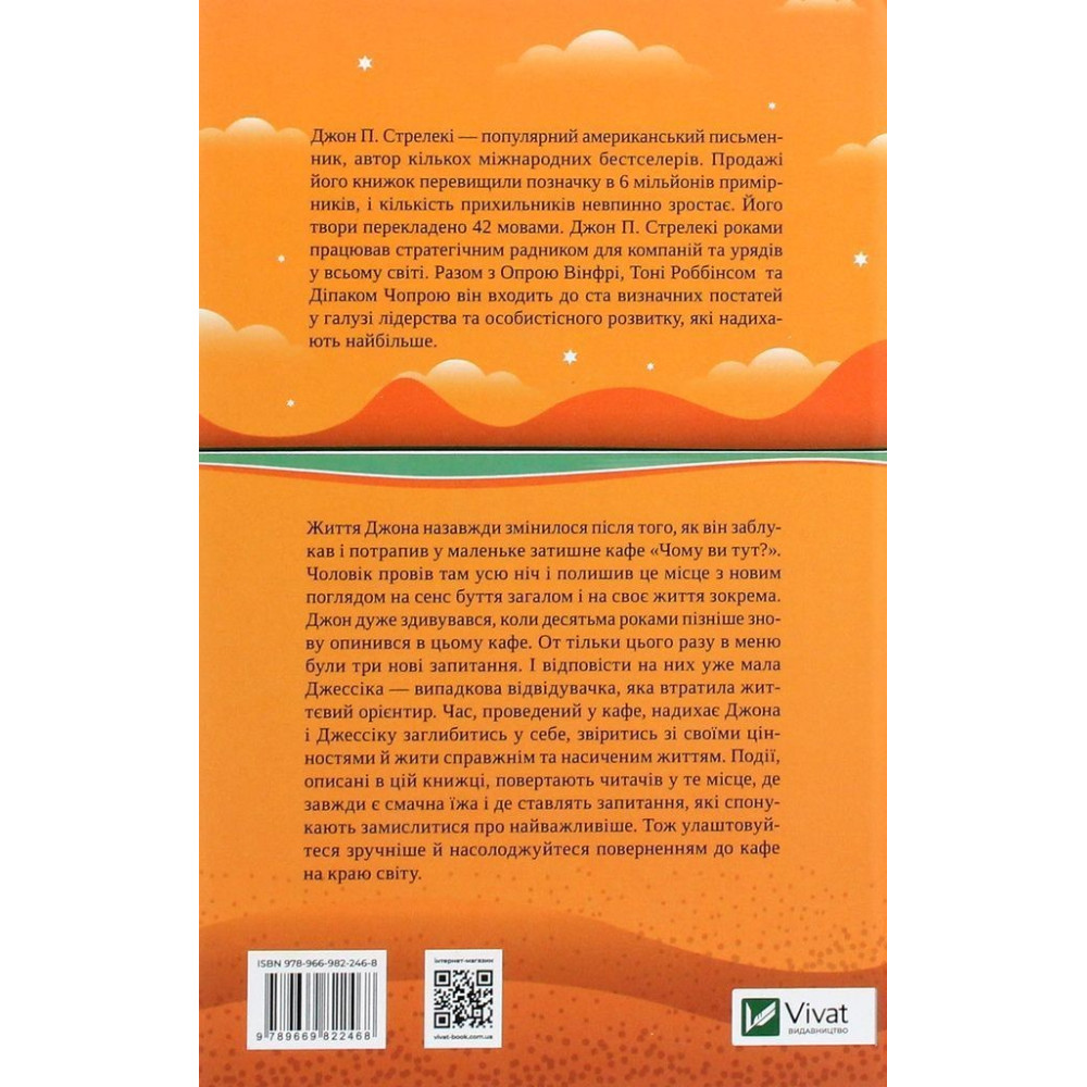 «Повернення до кафе на краю світу» за авторством Джона П. Стрелекі розповідає вражаючу історію про Джона, життя якого змінилося назавжди після подій попередньої книги («Кафе на краю світу»), в кафе під назвою «Чому ви тут?», де він провів усю ніч й потім покинув це місце з новим поглядом на своє життя та новим сенсом буття. Джон дуже здивувався, коли через десять років неочікувано знову опинився в цьому кафе. Але за десять років в меню з'явилося лише три нові запитання, й відповісти Джонові на них уже мала Джессіка — випадкова відвідувачка з втраченим життєвим орієнтиром. Зрештою час, який вони провели разом, надихає їх заглибитись у себе, аби звіритися зі своїми цінностями й зажити справжнім та насиченим життям. Події, описані в цій книжці, повертають читачів у те затишне місце, де завжди є смачна їжа і важливі запитання, що спонукають замислитися про життєві цінності.
