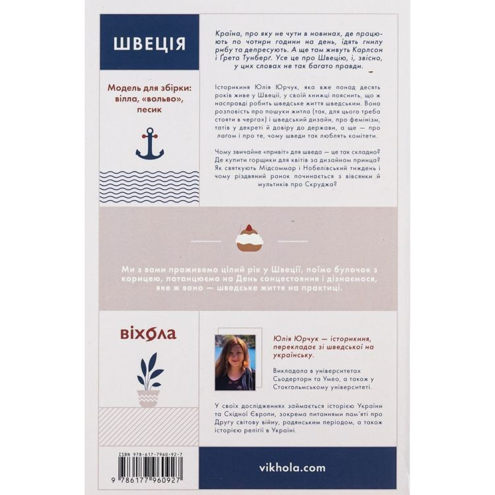 Історикиня Юлія Юрчук, яка вже понад десять років живе на Скандинавських островах, у книжці «Швеція. Модель для збірки: вілла, вольво, песик» пояснить, що ж насправді робить шведське життя шведським. Вона розповість про пошуки житла (так, для цього треба стояти в чергах) і шведський дизайн, про фемінізм, татів у декреті й довіру до держави, а ще — про лаґом і про те, чому шведи так люблять комітети.