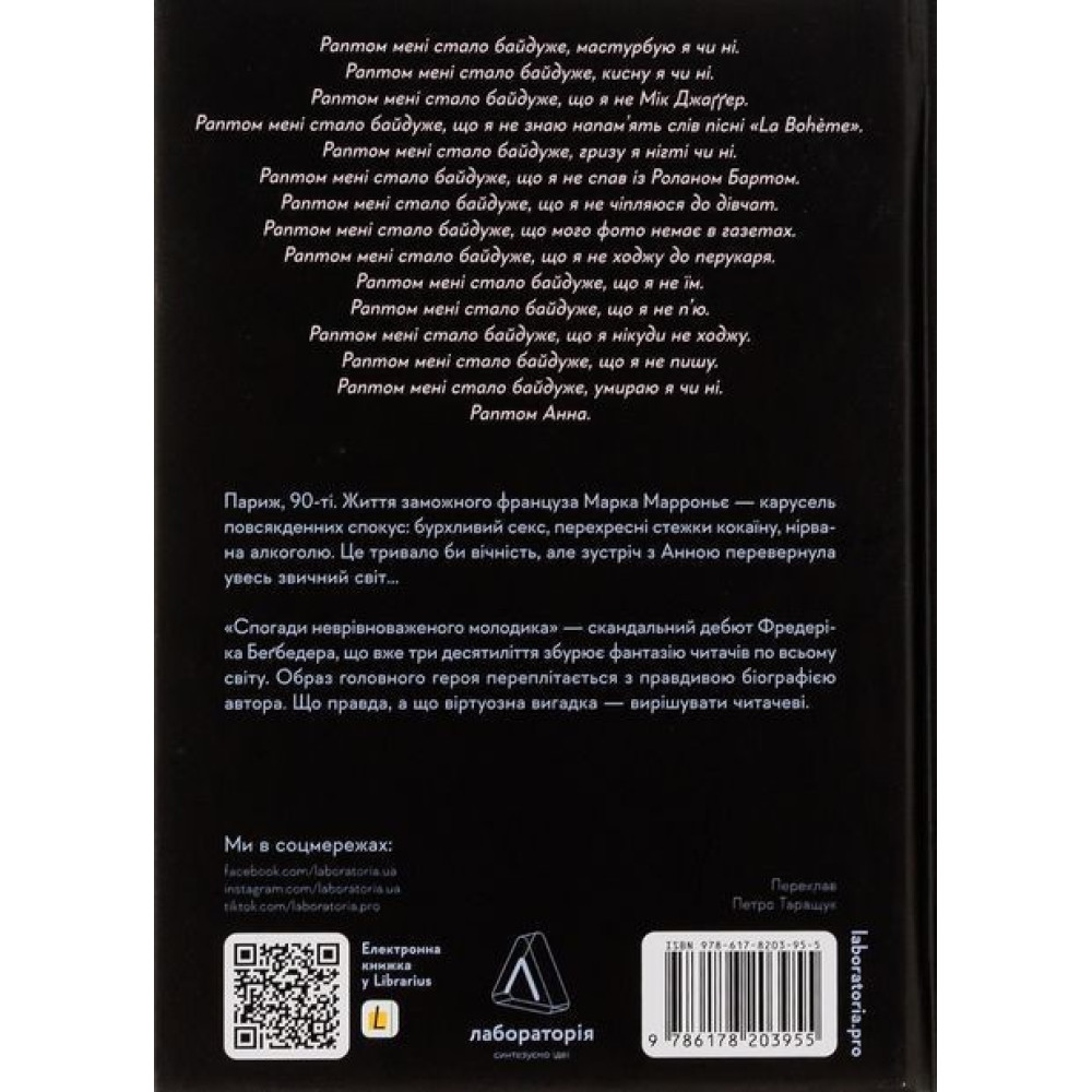 Книга «Спогади неврівноваженого молодика» Фредеріка Беґбедера розповідає злободенну історію життя Марка Марроньє — достатньо заможного молодого француза, який в захваті від вечірок, алкоголю, наркотиків і сексу. Цинічний, саркастичний, а моментами навіть жорстокий, він віддається насолодам, які щедро пропонує життя. Та що насправді стоїть за «ідеальною» картинкою і хто ховається за типово маскулінною маскою?