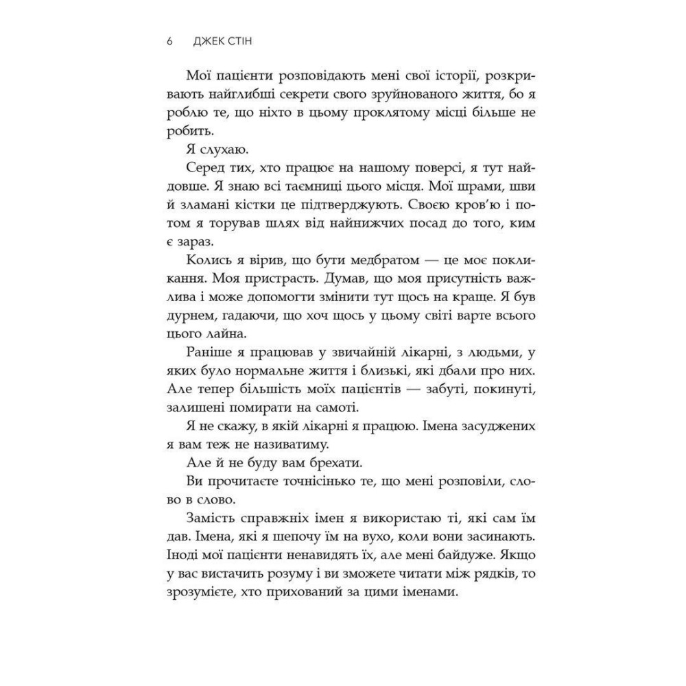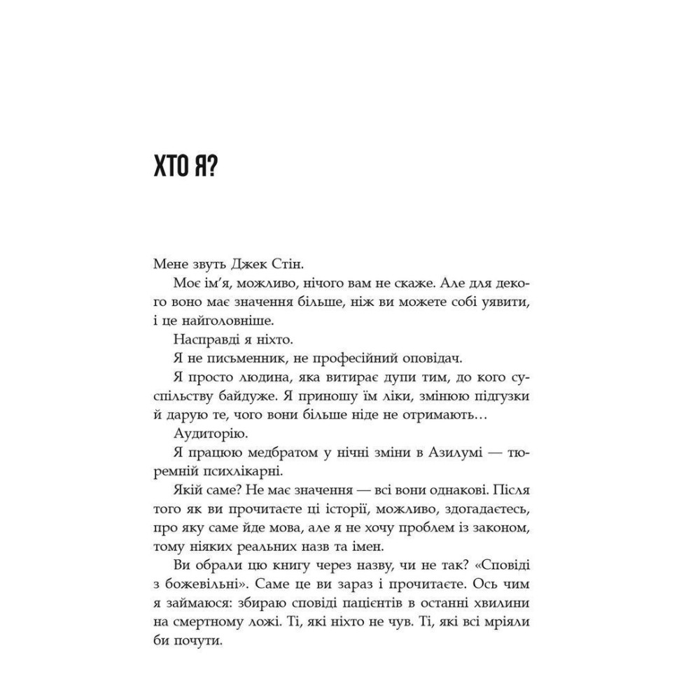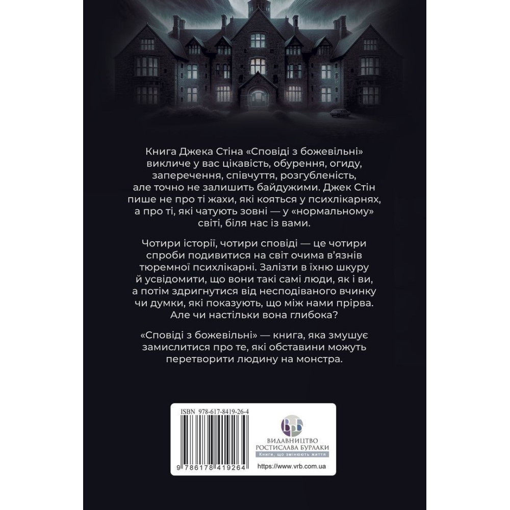 «Сповіді з божевільні. Книга перша» від Джека Стіна викличе у вас цікавість, обурення, огиду, заперечення, співчуття, розгубленість, але точно не залишить байдужими. Джек Стін пише не про ті жахи, які кояться у психлікарнях, а про ті, які чатують зовні — у «нормальному» світі, біля нас із вами.