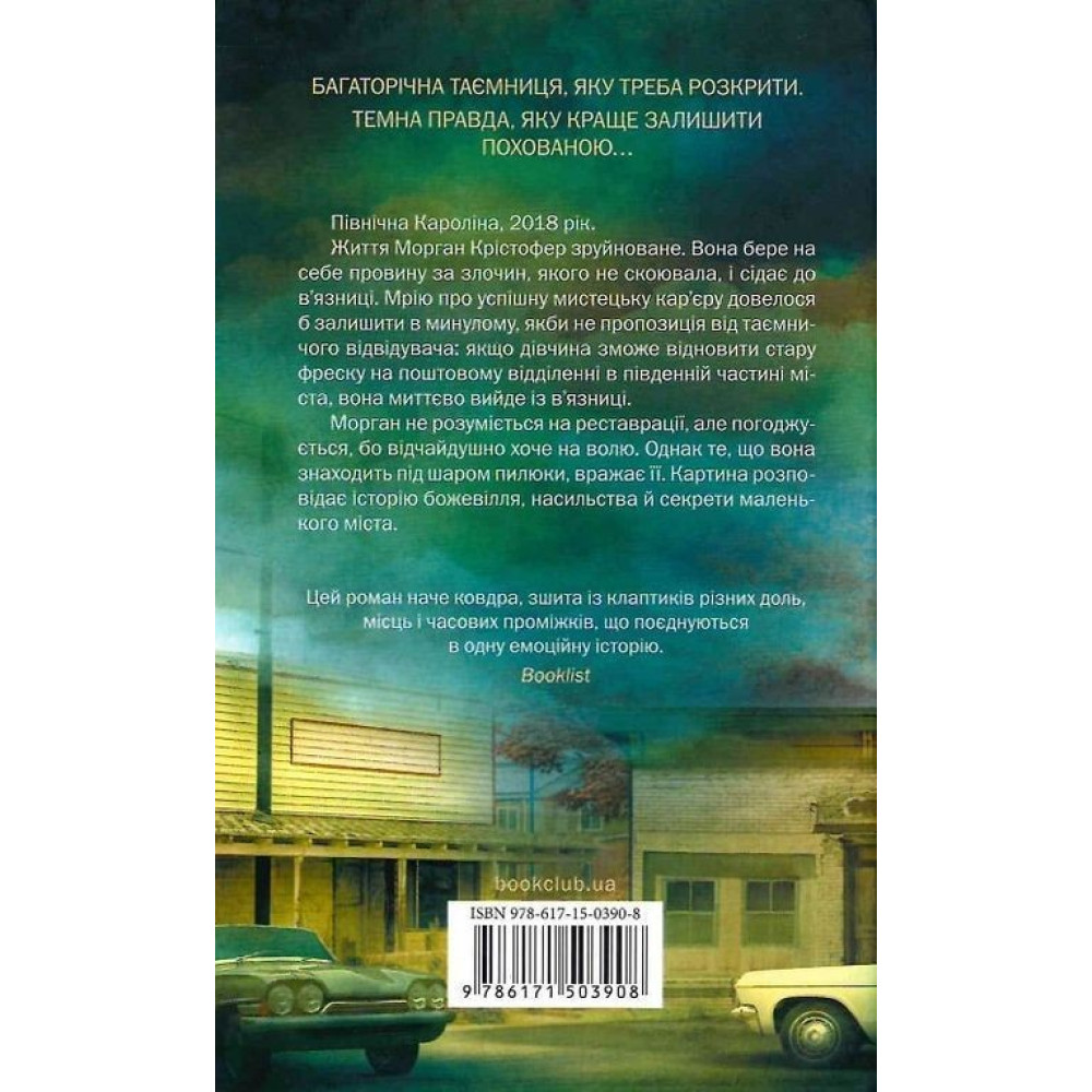 «Велика брехня у маленькому місті» за авторством Даян Чемберлен розповідає про Морган Крістофер, життя якої зруйноване: вона узяла на себе провину за злочин, якого не скоювала, і сіла до в’язниці. Мрію про успішну мистецьку кар’єру довелося б залишити в минулому, якби не пропозиція від таємничого відвідувача, за якою дівчина повинна відновити стару фреску на поштовому відділенні в південній частині міста, щоб потім миттєво вийти із в’язниці. Морган, на жаль, не розуміється на реставрації, але погоджується, адже відчайдушно хоче на волю. Однак те, що вона знаходить під шаром пилюки, вражає її й тим самим неочікувано впливає на її ж долю.