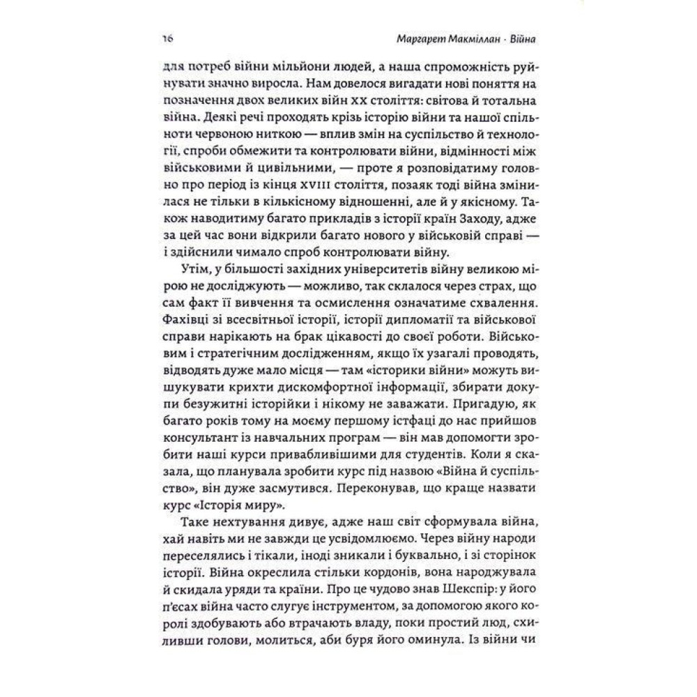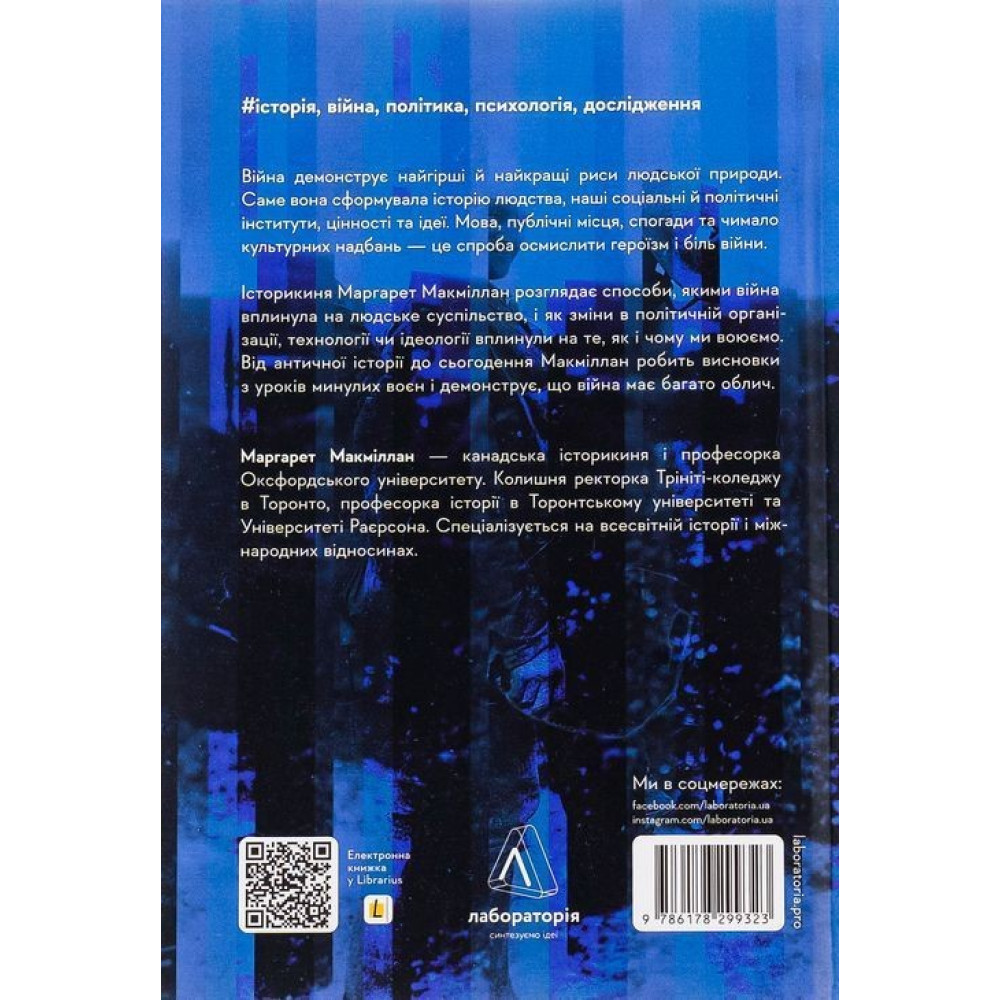 Історикиня Маргарет Макміллан в книзі «Війна. Як конфлікти формували нас» розглядає способи, якими війна вплинула на людське суспільство, і як зміни в політичній організації, технології чи ідеології вплинули на те, як і чому ми воюємо. Від античної історії до сьогодення Макміллан робить висновки з уроків минулих воєн і демонструє, що війна має багато облич.