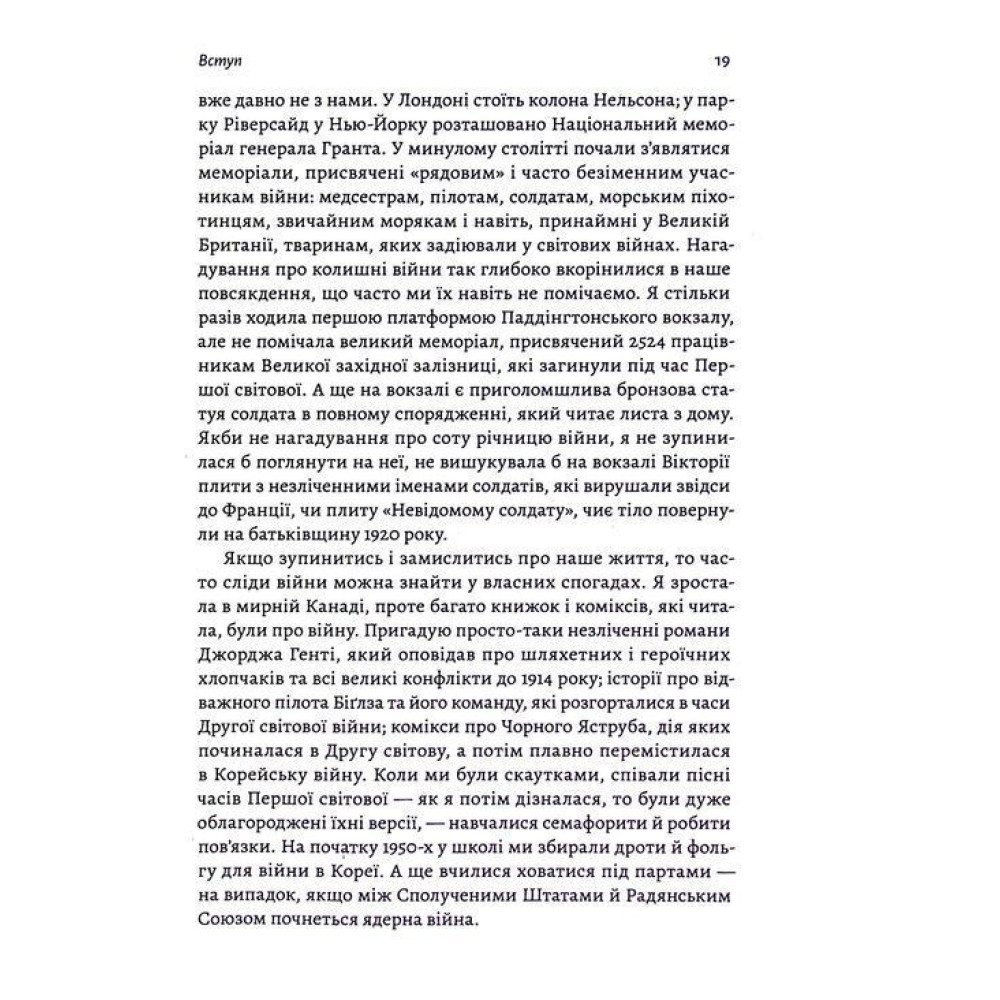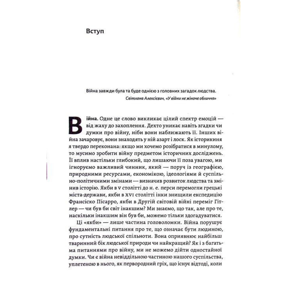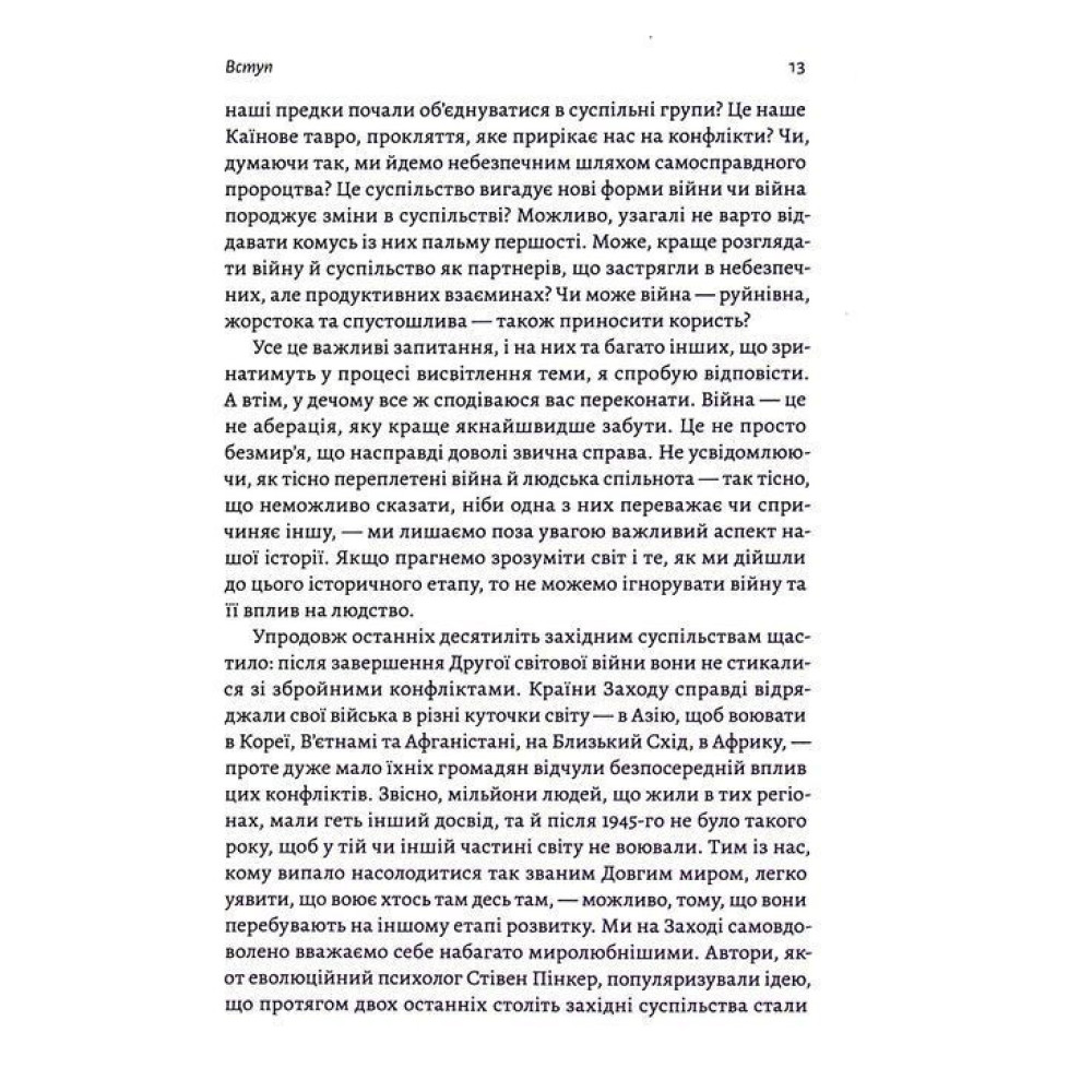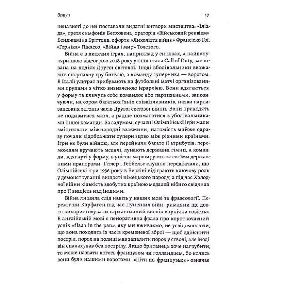 Адже вона розкриває найгірші і найкращі риси людської природи. Саме вона сформувала історію людства, наші соціальні й політичні інститути, цінності й ідеї. Мова, публічні місця, спогади та чимало культурних надбань — це спроба осмислити героїзм та біль війни.